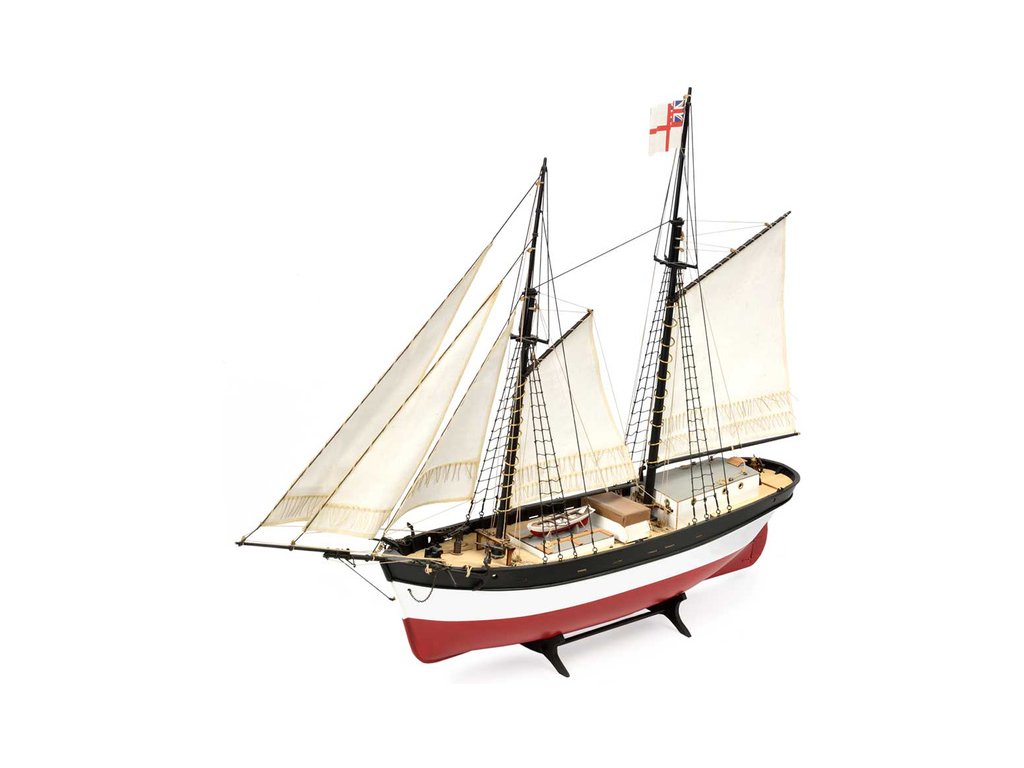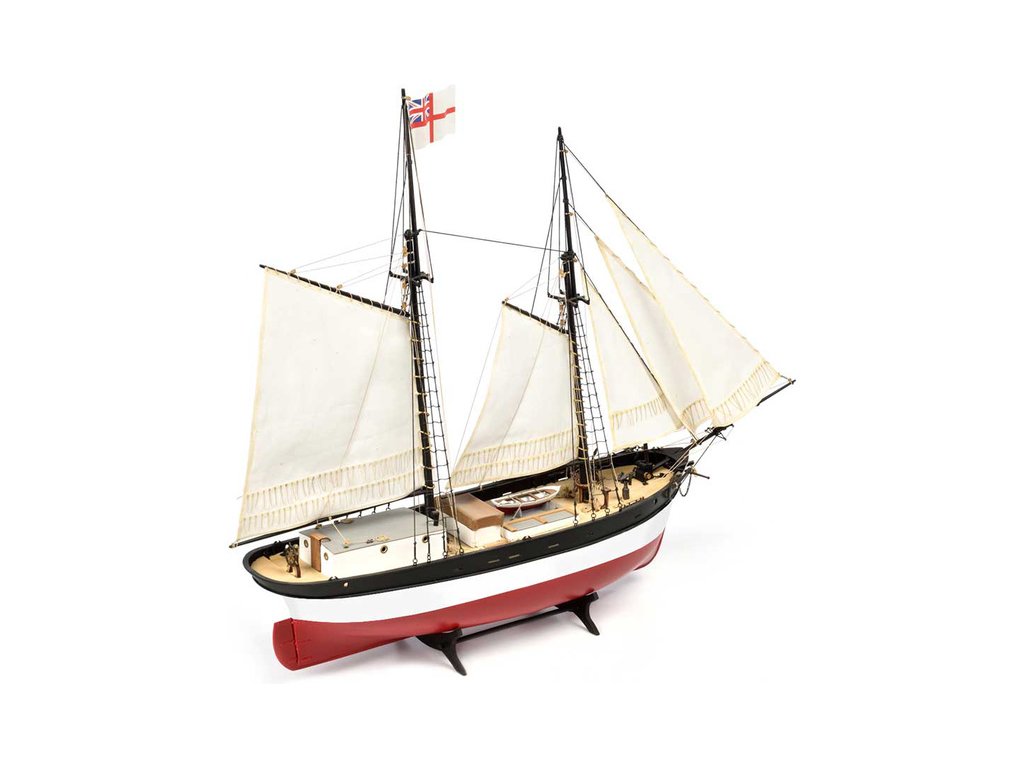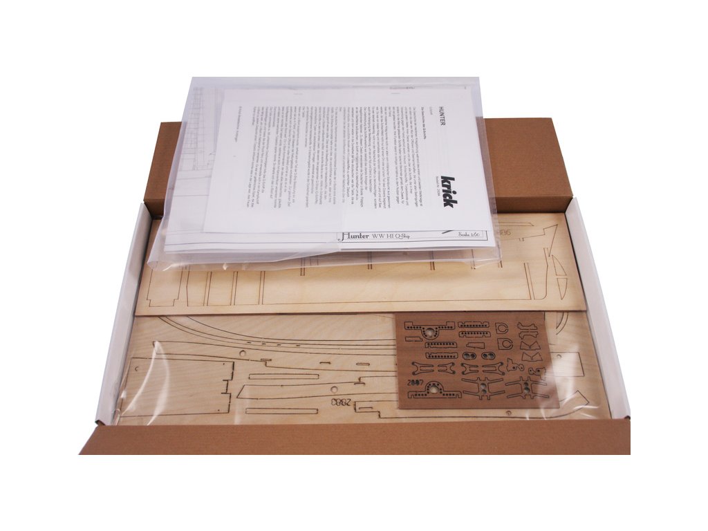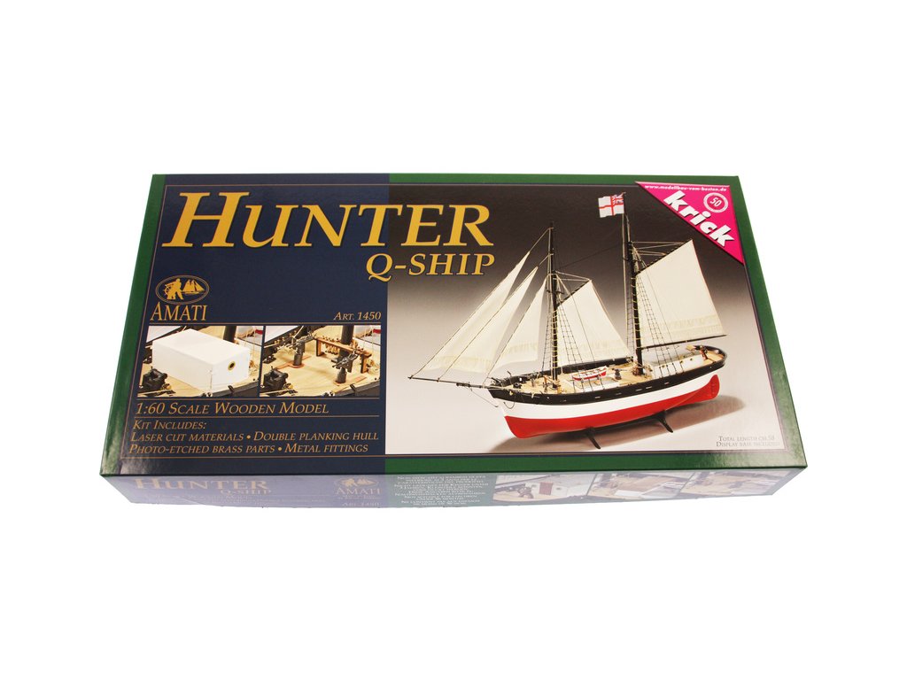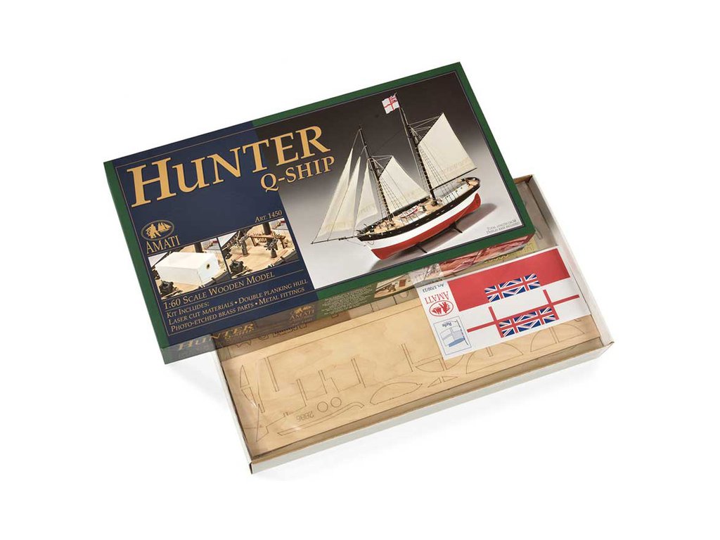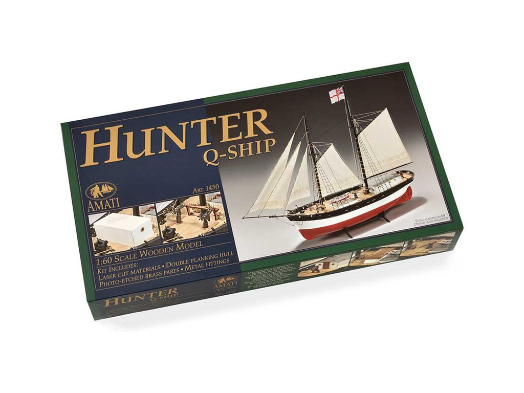 Stavebnice statické makety lodi, H.M.S. Hunter škuner 1:60 kit. Tato obchodní loď patřila britskému obchodnímu loďstvu. Loď byla přestavěna v loděnici Queenstown, Irsko (odtud jméno Q-ship) pro válečné účely. Dřevěné díly jako kýl a obšívka jsou řezány laserem, obsahuje plachty, lanoví, stožáry, kování a plány.