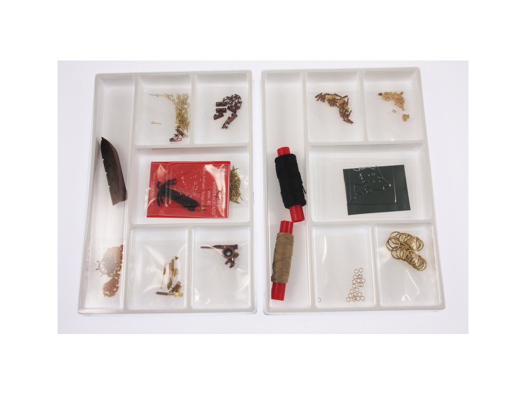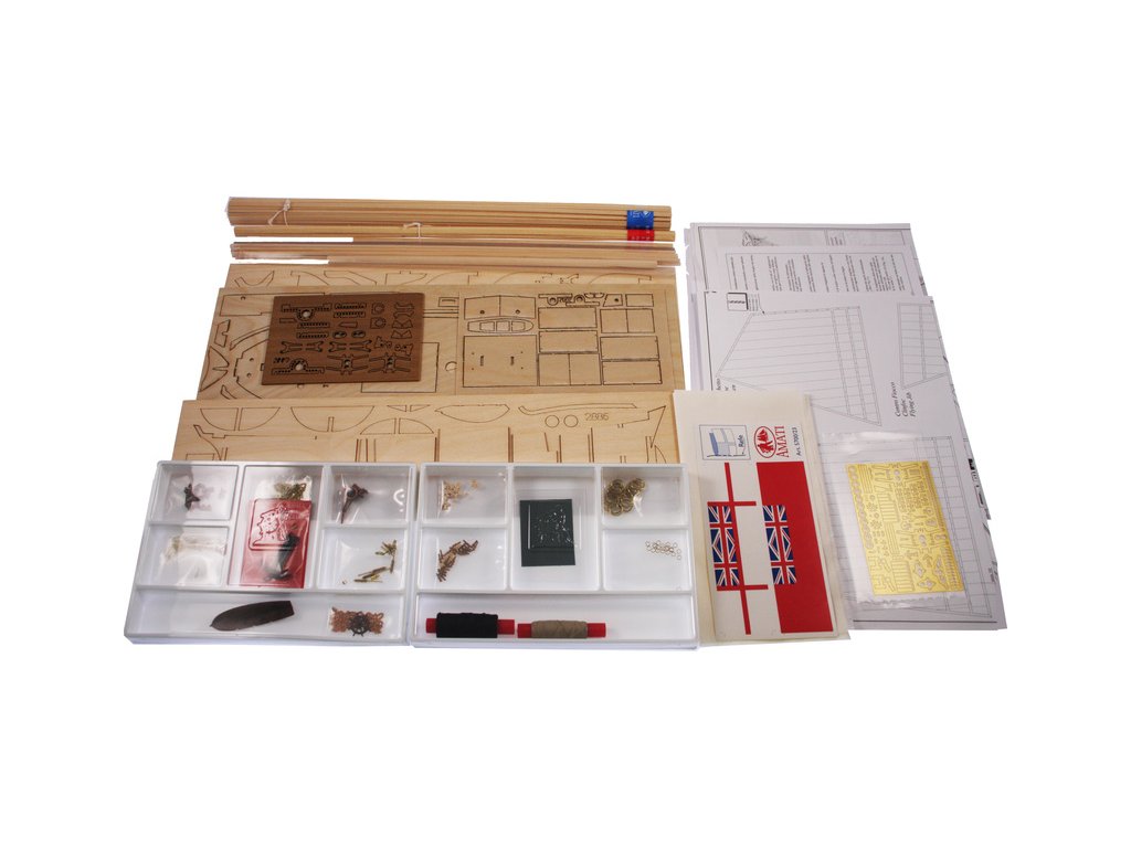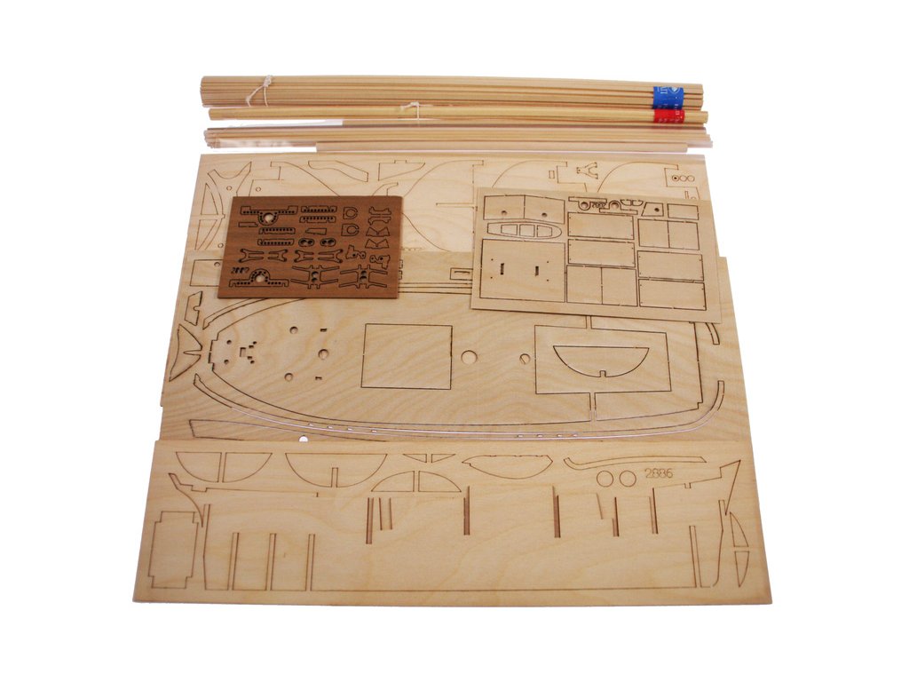 Po otevření víka krabice naleznete dřevěné díly modelu z překližky, sadu lišt, drobné součásti uzavřené v plastovém průhledném blistru, sadu výkresů a manuál.