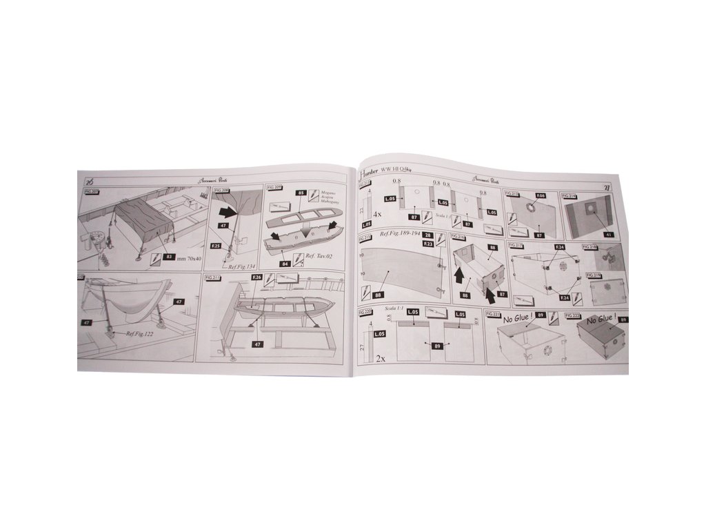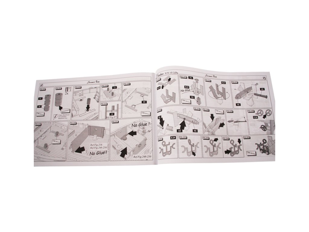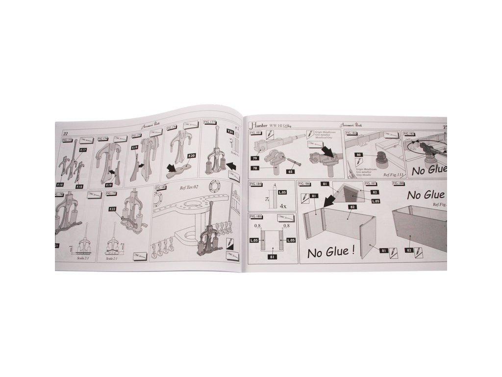 Set obsahuje kompletní sadu výkresové dokumentace modelu v měřítku 1:1 s postupem stavby, na výkrese jsou pečlivě označeny díly a je zde i seznam jednotlivých součástí modelu.
