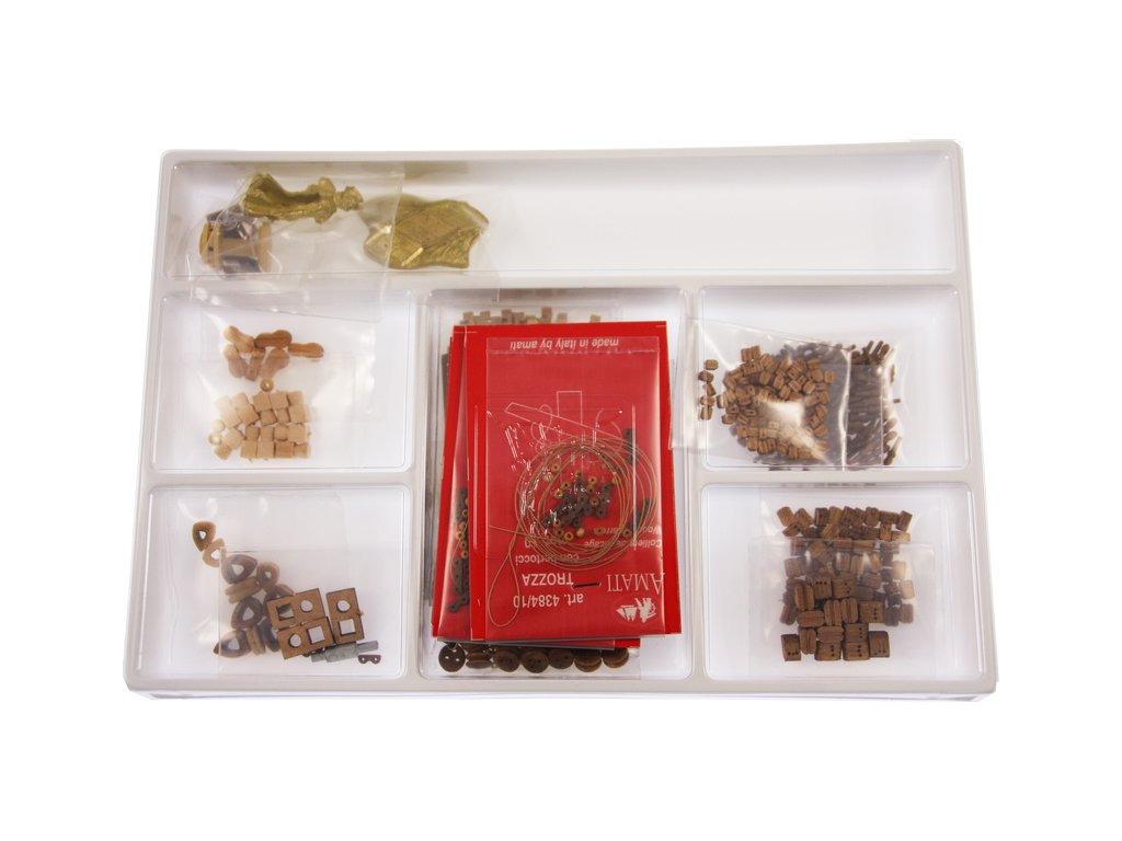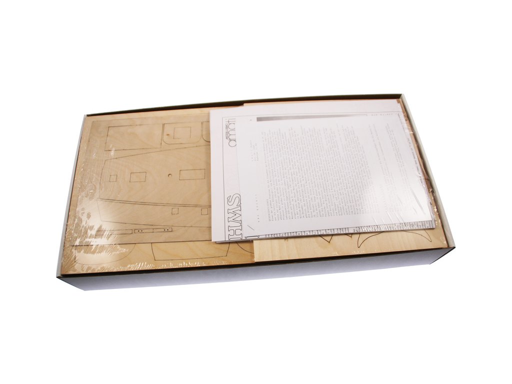 Po otevření víka krabice naleznete dřevěné díly modelu z překližky, sadu lišt, drobné součásti uzavřené v plastovém průhledném blistru, sadu výkresů a manuál.