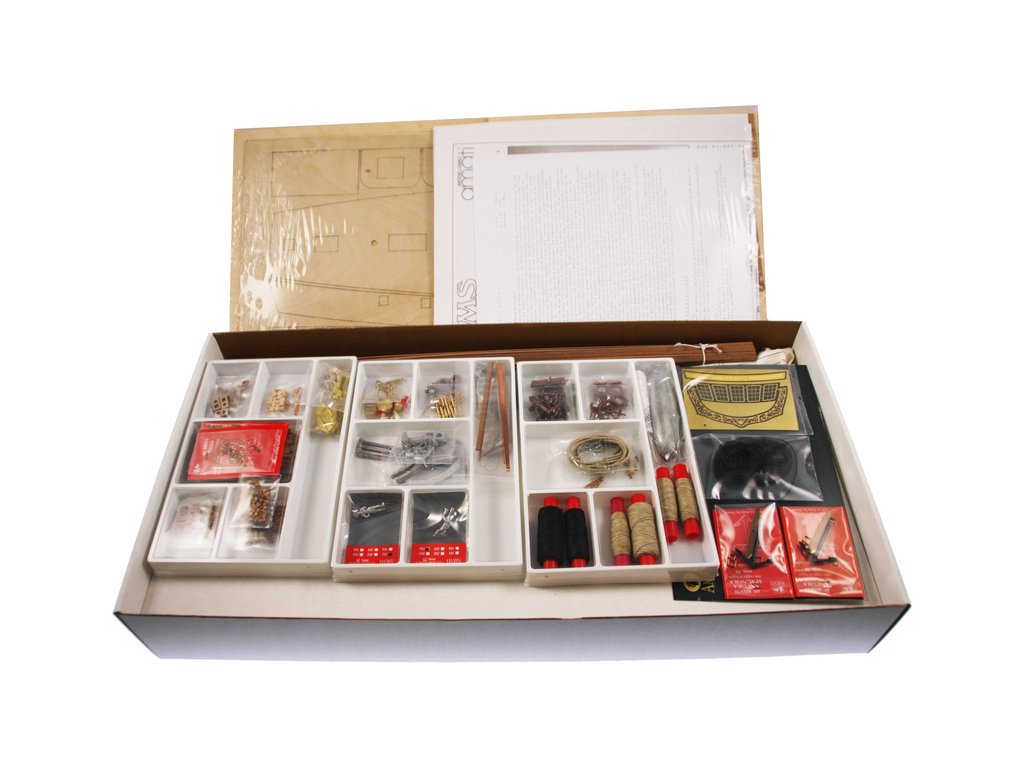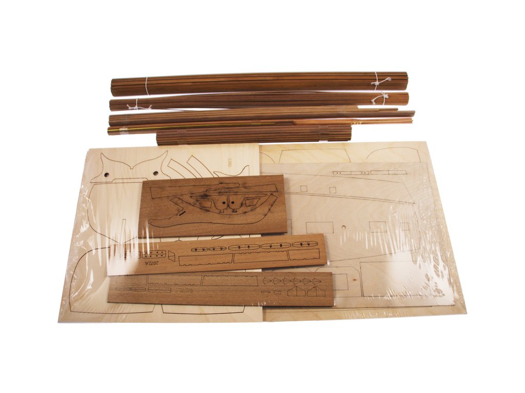 Balení obsahuje sadu překližkových dílů, sadu dřevěných lišt o různém průřezu, blistr s drobnými díly, sadu výkresů a vícejazyčný manuál.