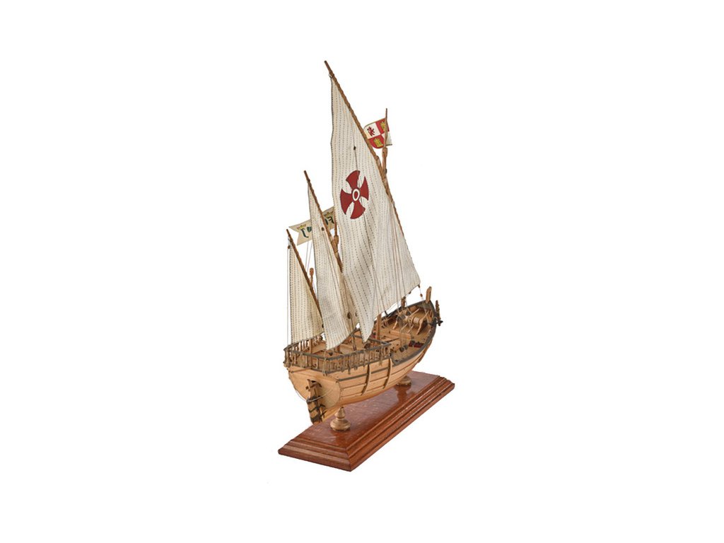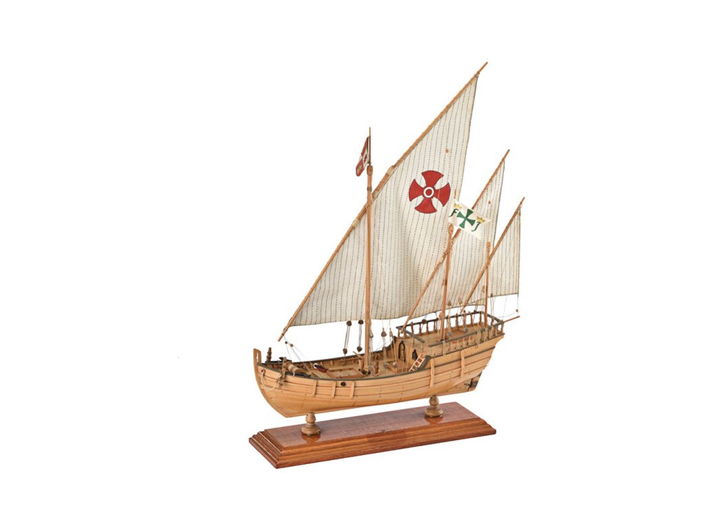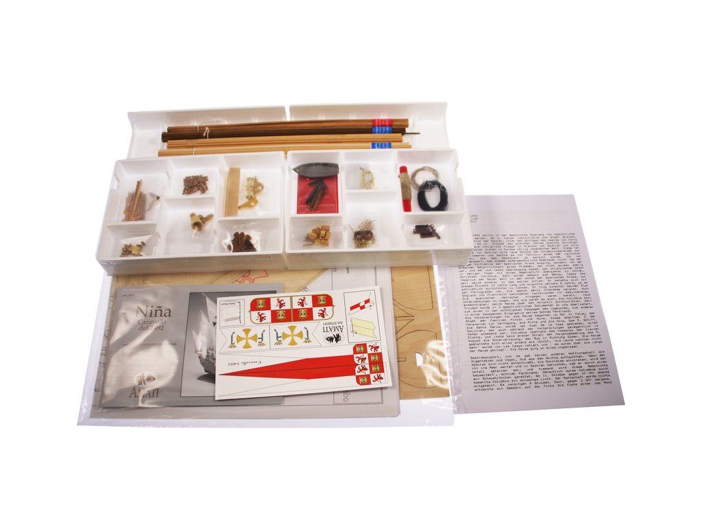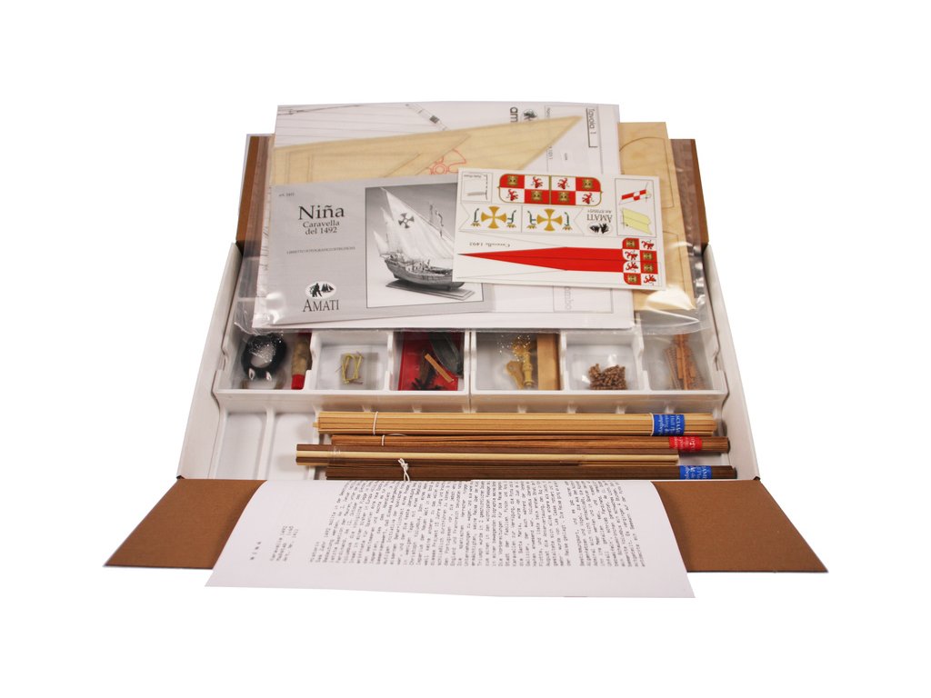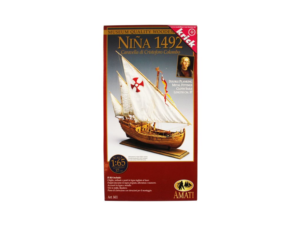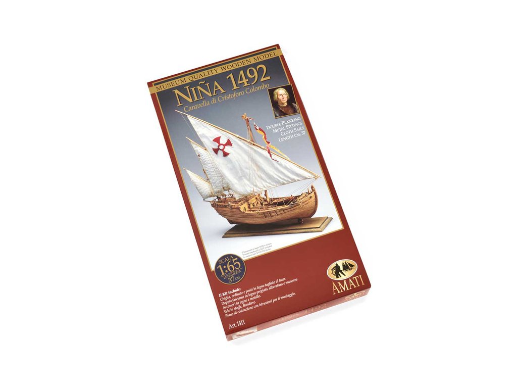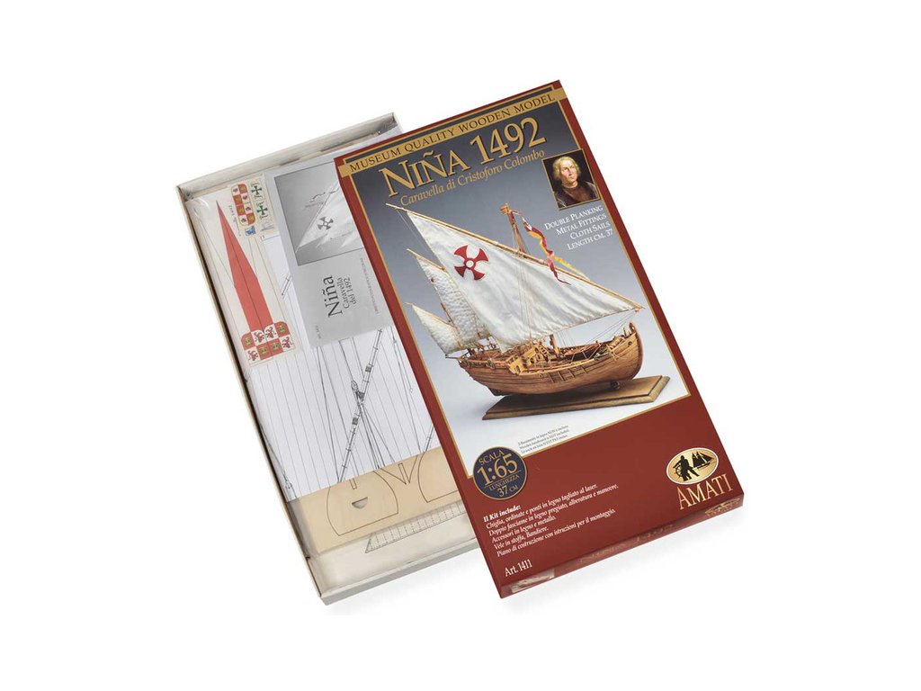Stavebnice statické makety lodi, AMATI Niňa karavela z roku 1492 v měřítku 1:65 kit. Jedna ze tří lodí, s nimiž Kryštof Kolumbus objevil Ameriku. Tento model je součástí série Columbus společnosti AMATI. Dřevěné díly jako kýl a obšívka jsou řezány laserem, obsahuje plachty, lanoví, stožáry, kování a plány.