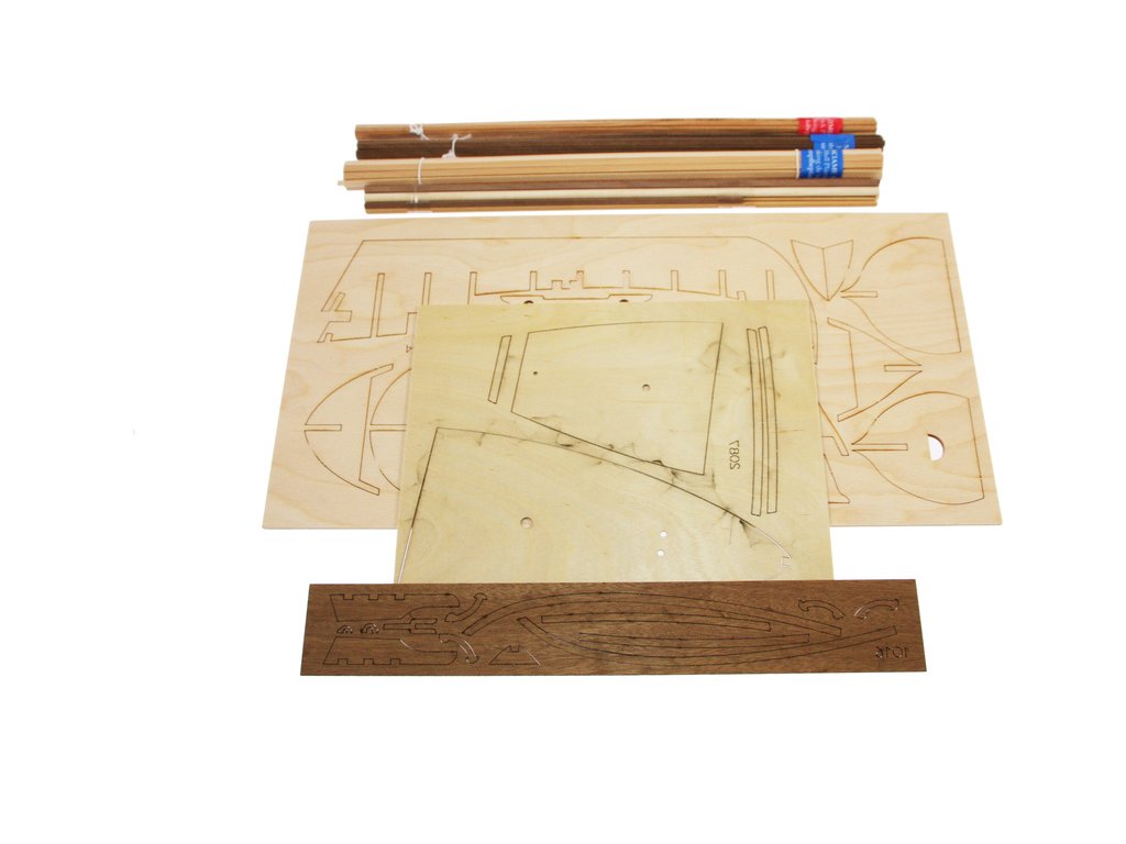 Balení obsahuje sadu překližkových dílů, sadu dřevěných lišt o různém průřezu, blistr s drobnými díly, sadu výkresů a vícejazyčný manuál.