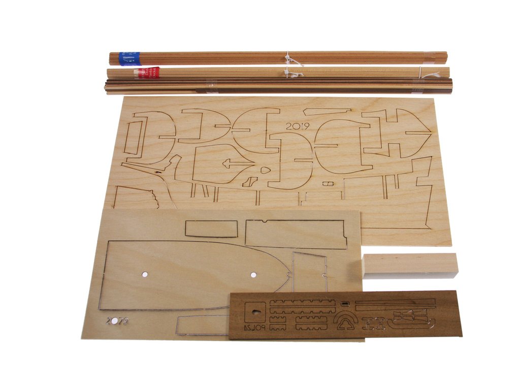 Balení obsahuje sadu překližkových dílů, sadu dřevěných lišt o různém průřezu, blistr s drobnými díly, sadu výkresů a vícejazyčný manuál.