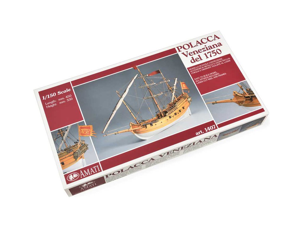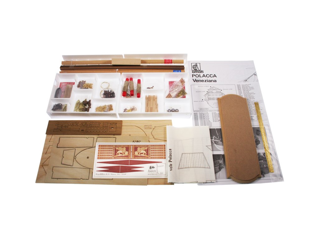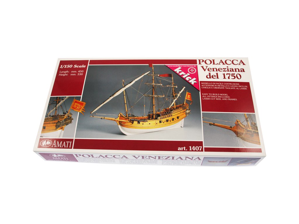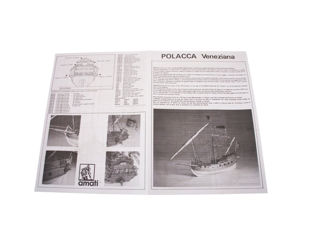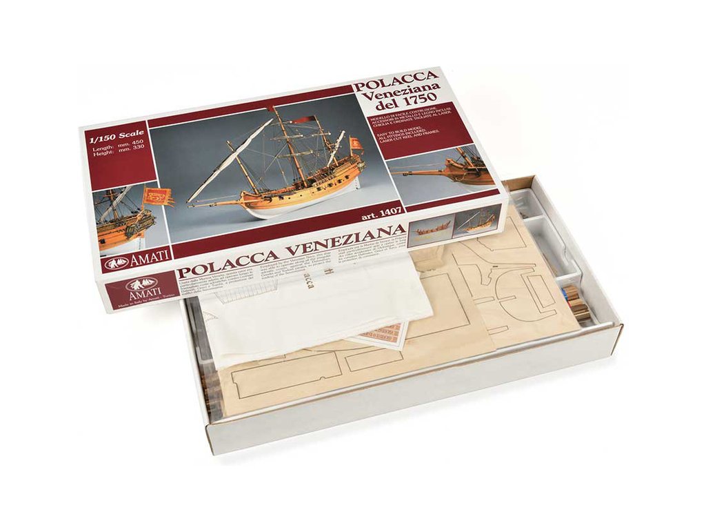 Stavebnice statické makety historické lodi AMATI Polacca benátská loď z roku 1750, verze kit. Plavila se na počátku 18. století ve Středomoří a byla používána jako komerční nebo nákladní loď. Benátská flotila používala Polack k ochraně svých lodních tras od dalmatských, řeckých a tureckých pirátů. Dřevěné díly jako kýl a obšívka jsou řezány laserem, obsaženy jsou stěžně, plachty, lanoví, stejně jako děla, plány a dekorativní stojan pro lodě.