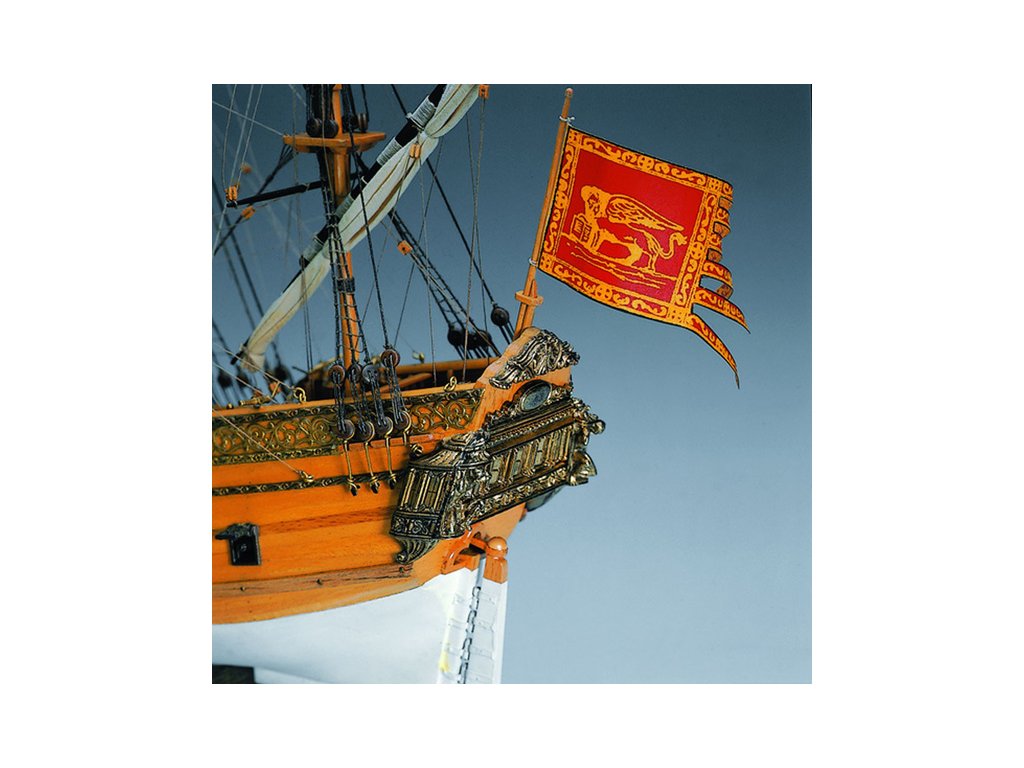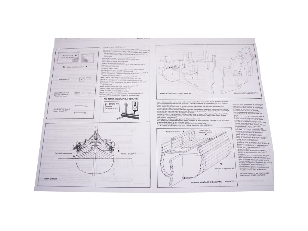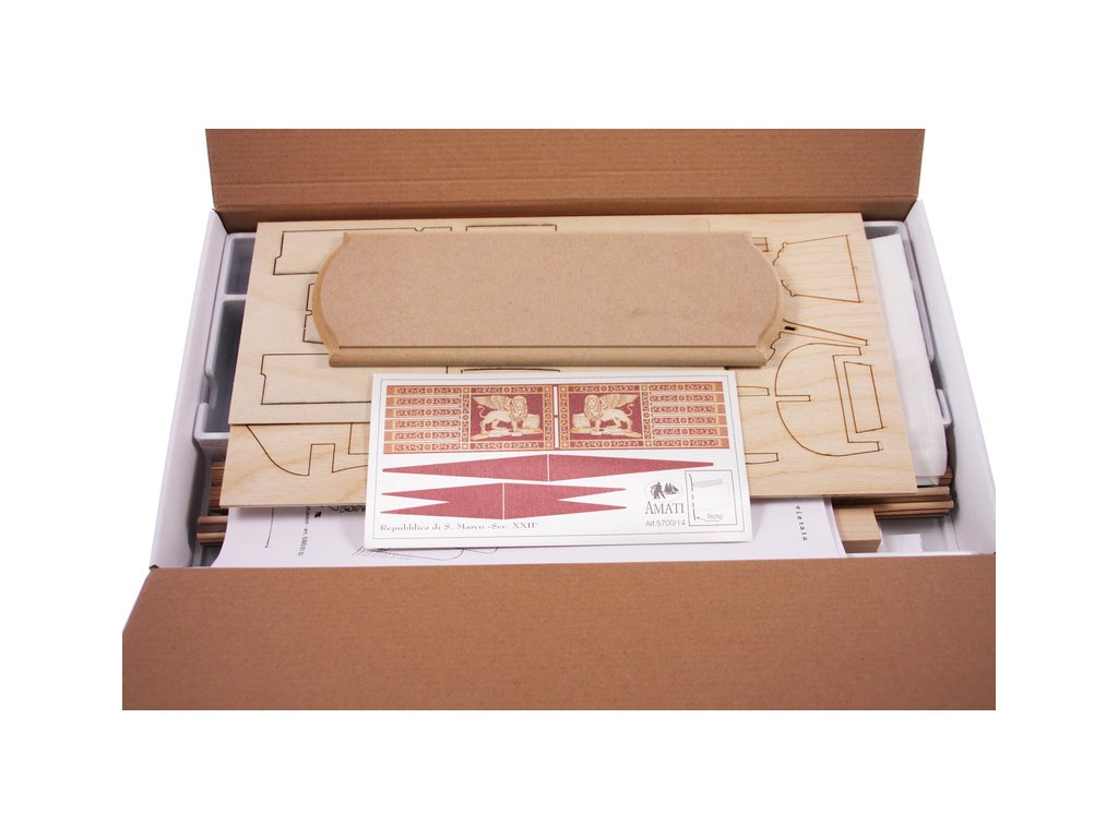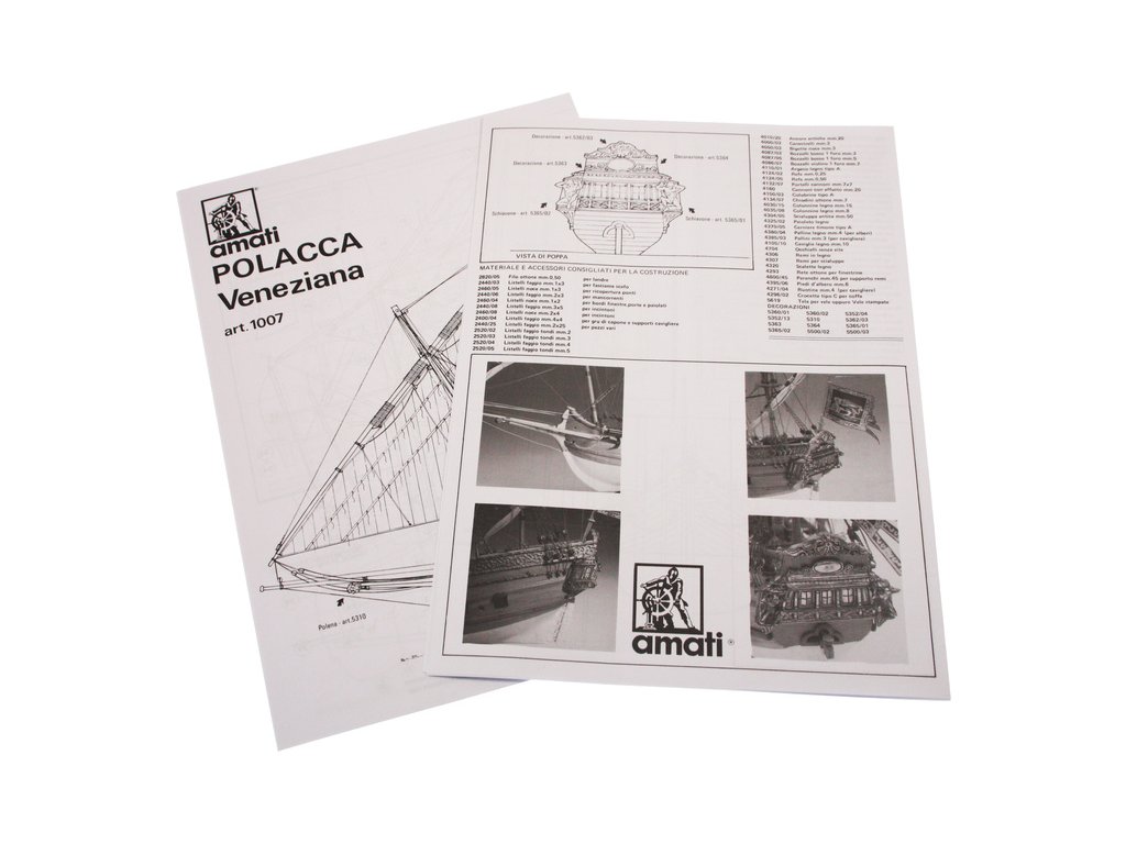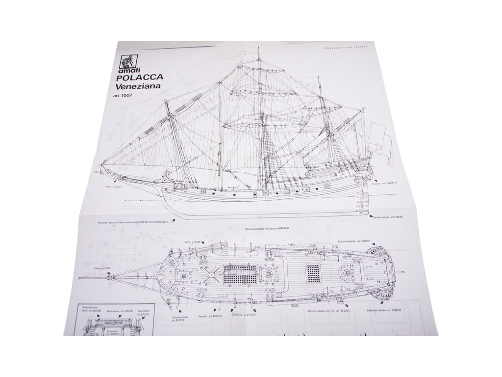 Stavebnice statické makety historické lodi AMATI Polacca benátská loď z roku 1750, verze kit. Plavila se na počátku 18. století ve Středomoří a byla používána jako komerční nebo nákladní loď. Benátská flotila používala Polack k ochraně svých lodních tras od dalmatských, řeckých a tureckých pirátů. Dřevěné díly jako kýl a obšívka jsou řezány laserem, obsaženy jsou stěžně, plachty, lanoví, stejně jako děla, plány a dekorativní stojan pro lodě.