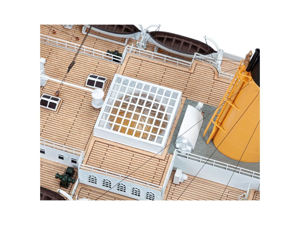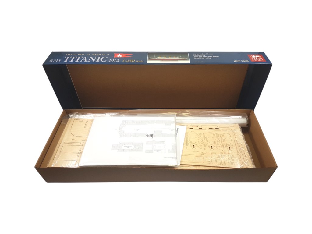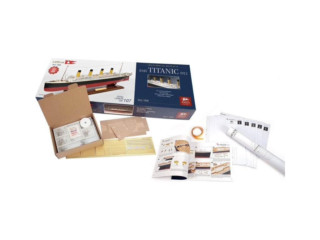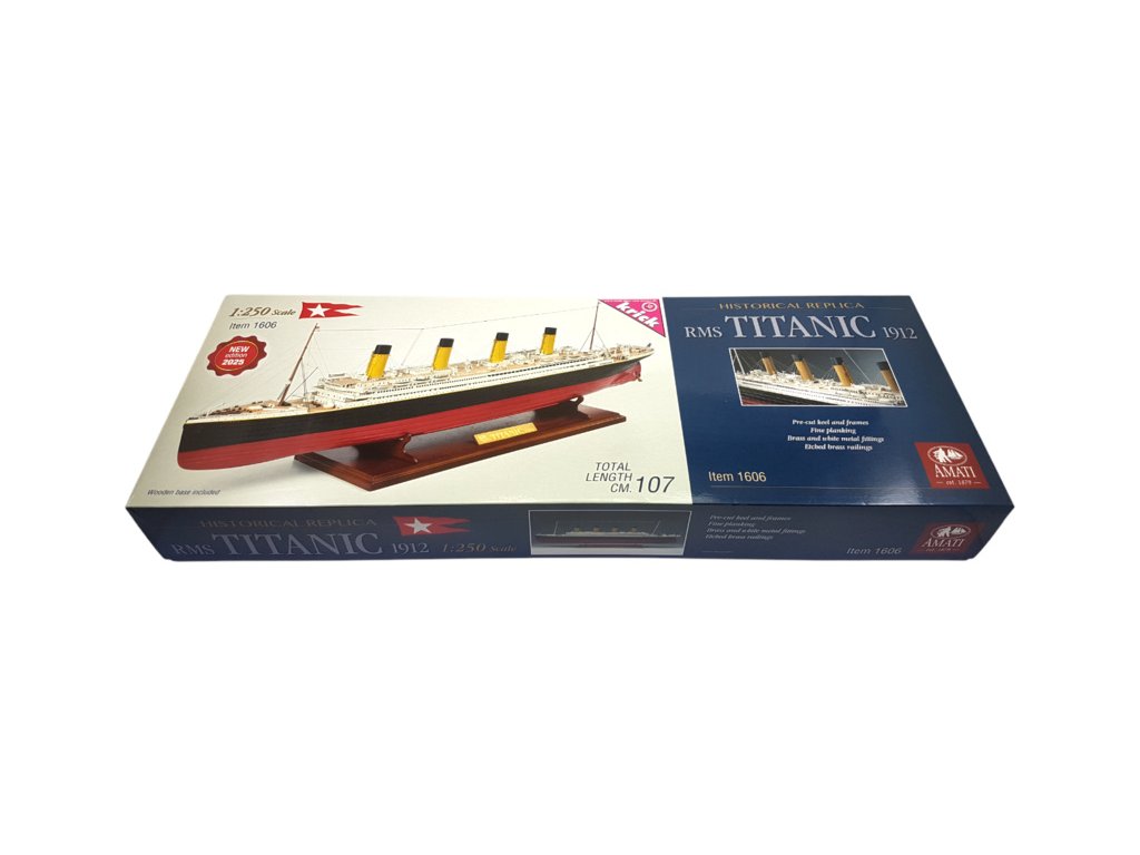 Stavebnice statické makety lodi AMATI R.M.S. Titanic v měřítku 1:250 s délkou 1070mm v edici 2025 je ještě realističtější. Je určena nejzkušenějším modelářům, kteří jsou připraveni sestavit stavebně i časově náročnou věrnou maketu. Konstrukce je z laserem řezané překližky a dřevěných dílů. V balení je řada drobných detailů, hodnotných fotolepů, kování a další.