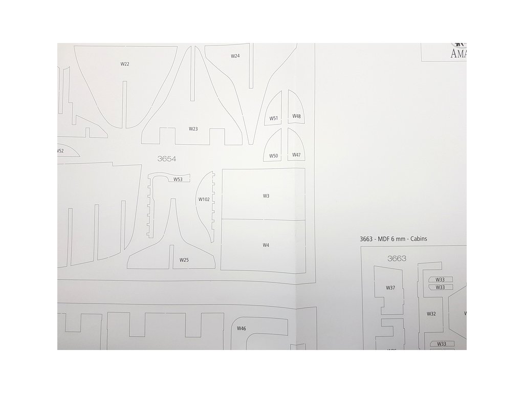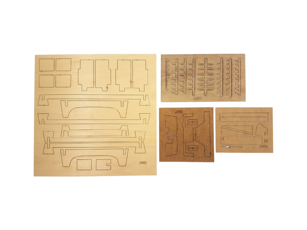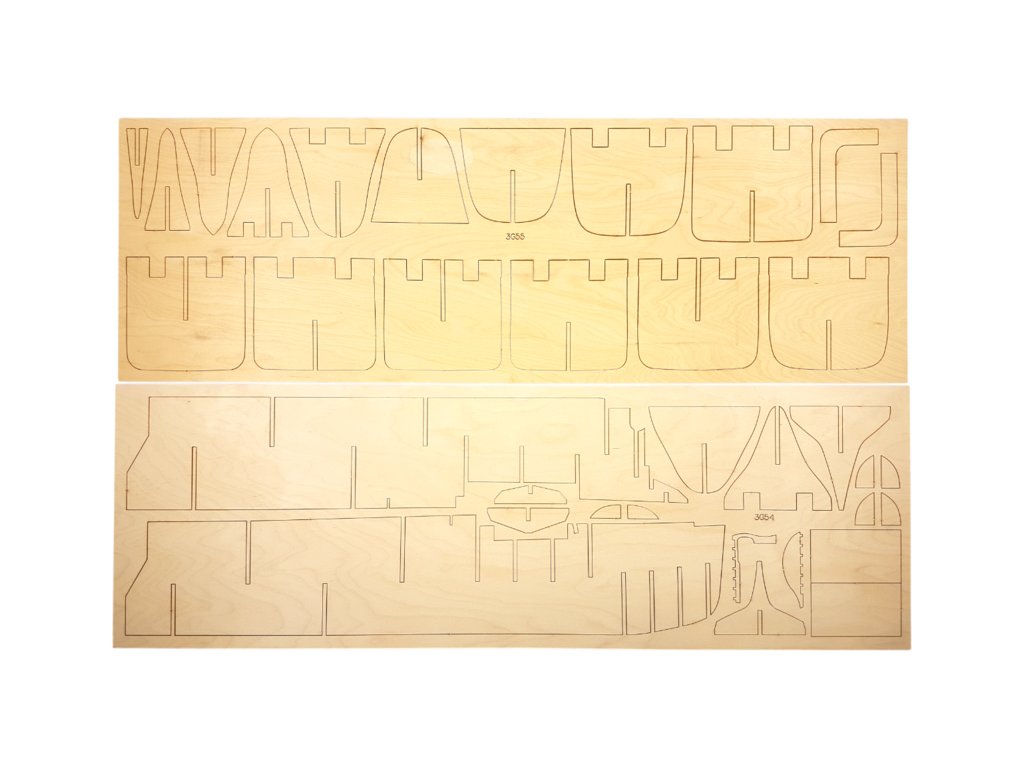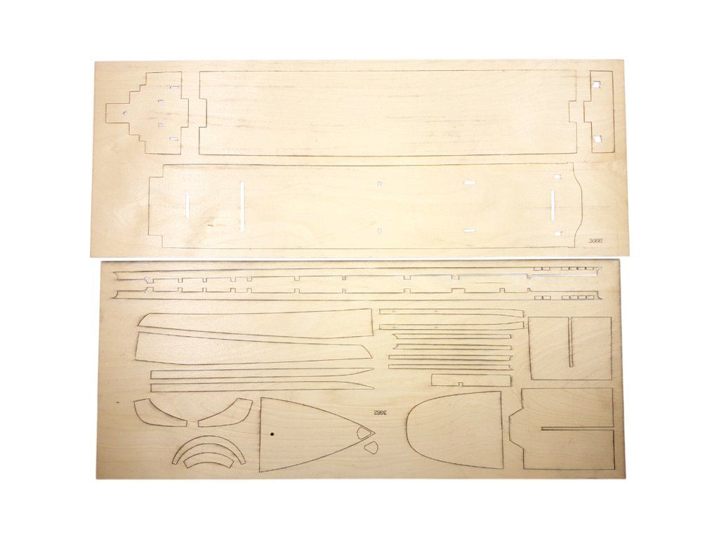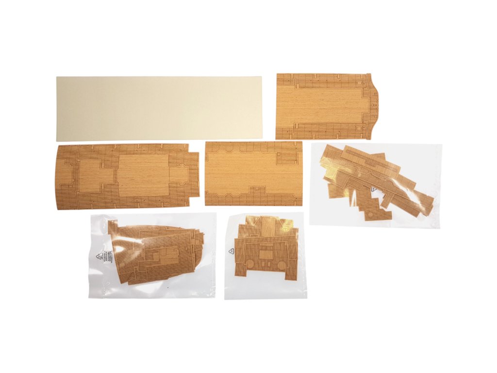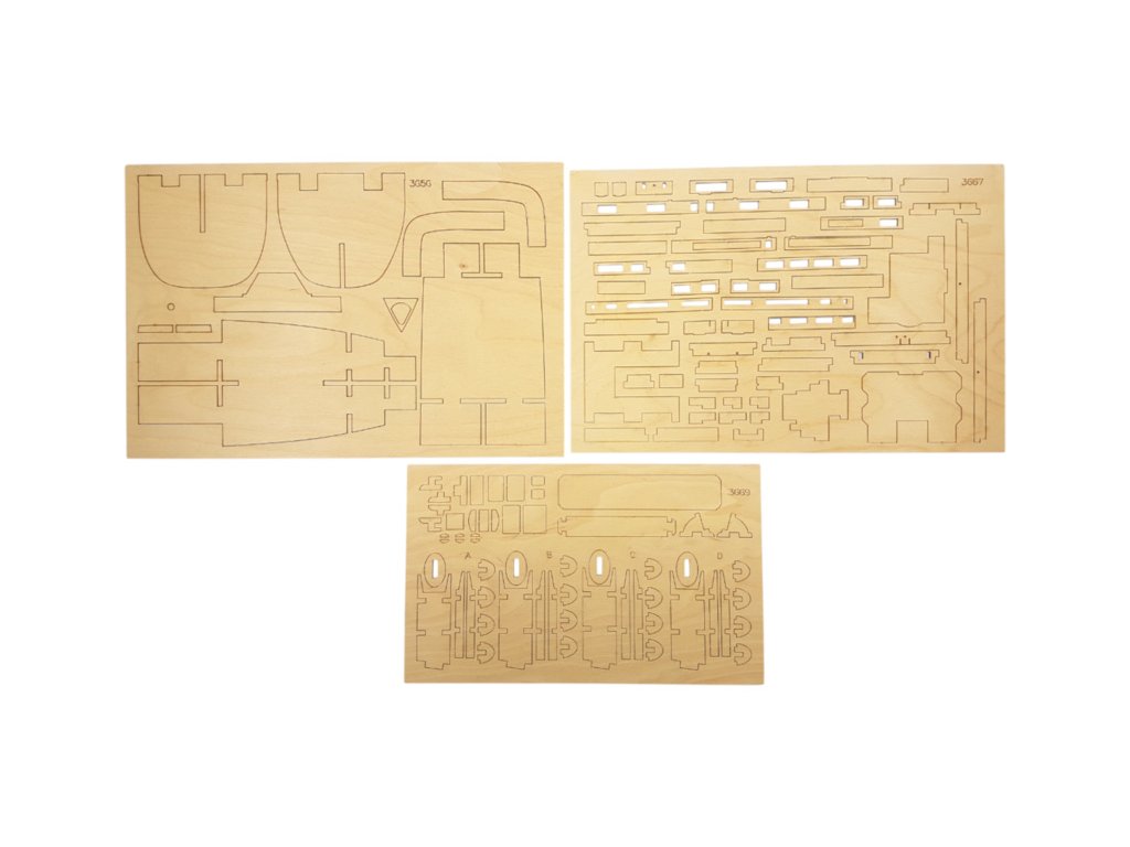 Po otevření víka krabice naleznete dřevěné díly modelu z překližky, sadu lišt, fotoleptané díly, drobné součásti uzavřené v plastovém průhledném blistru, sadu výkresů a manuál.