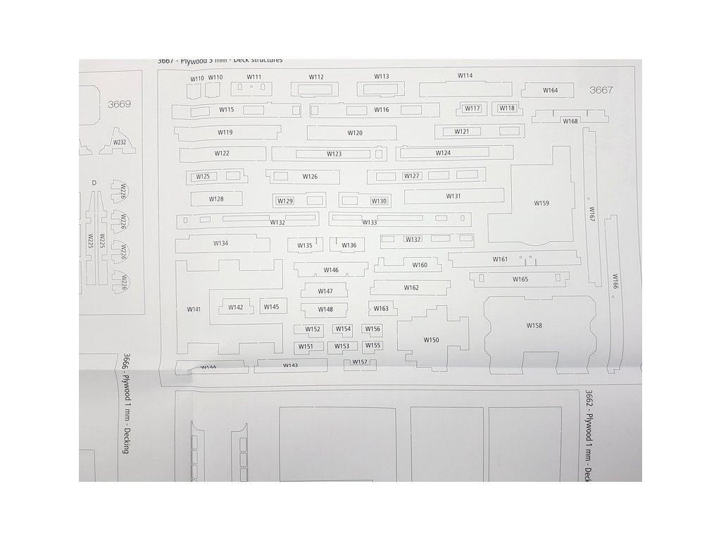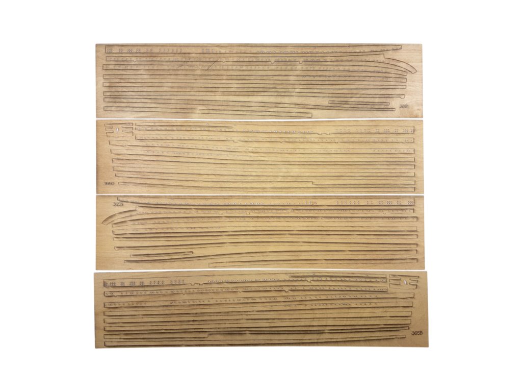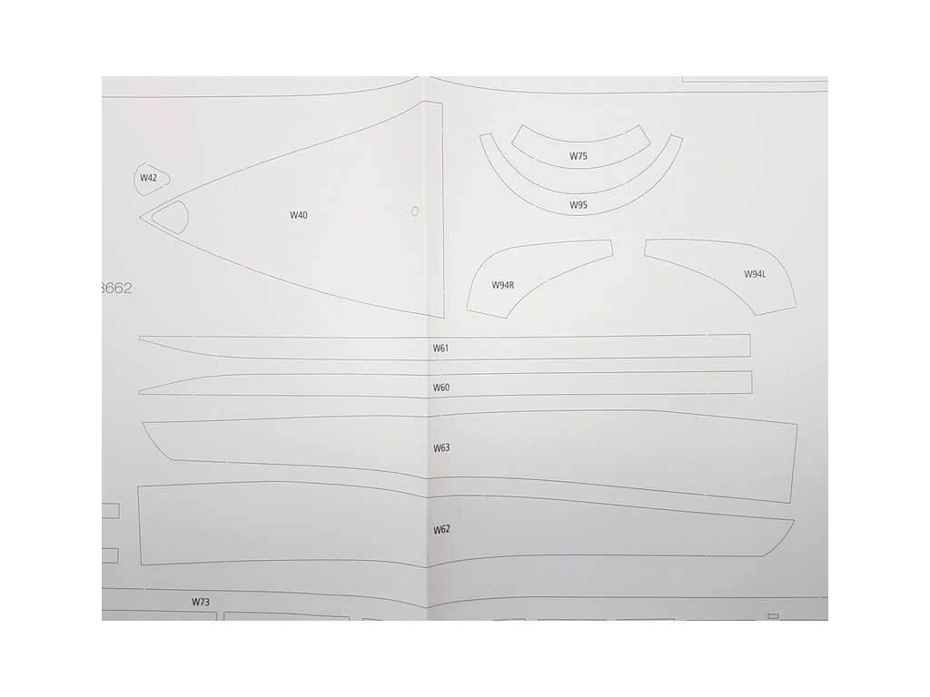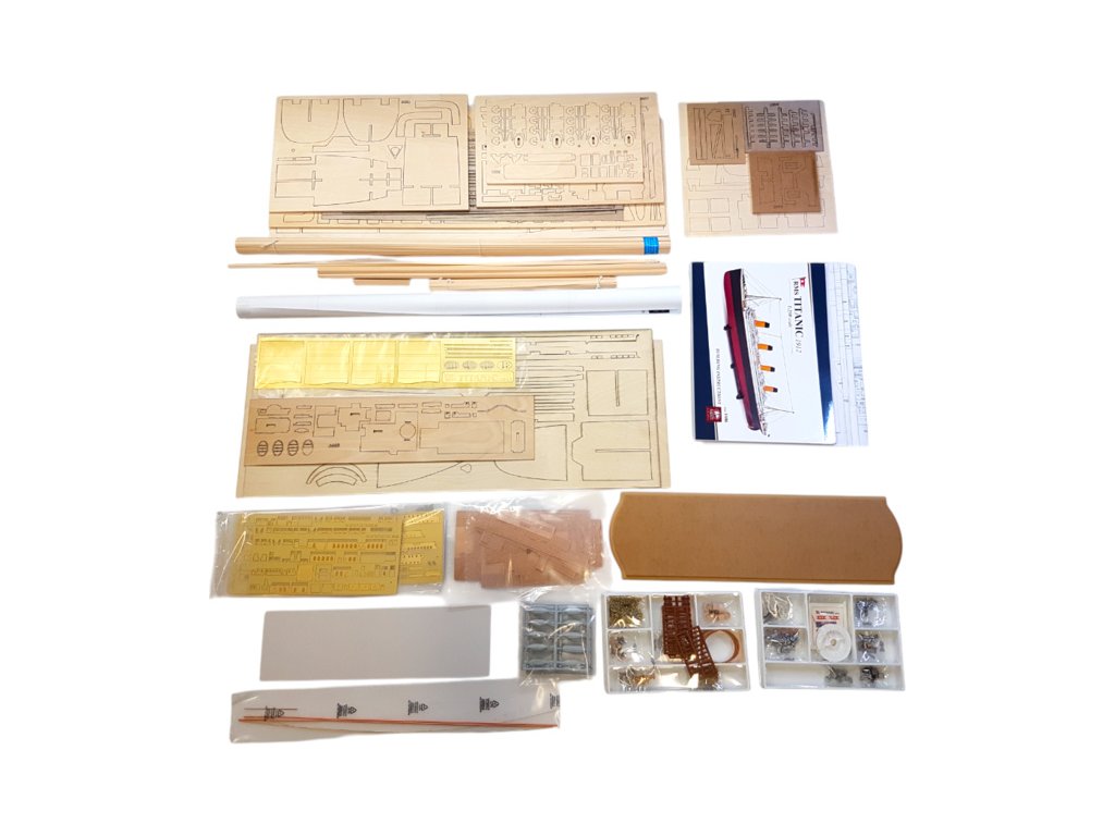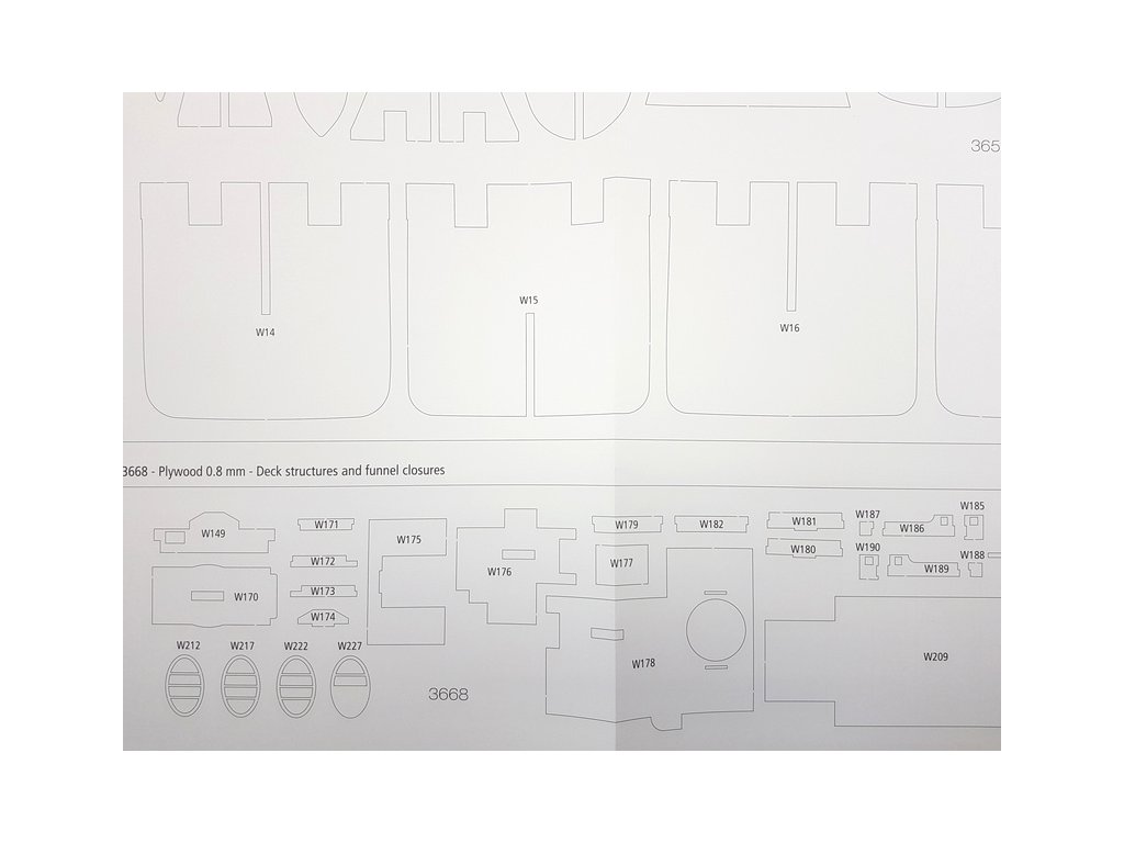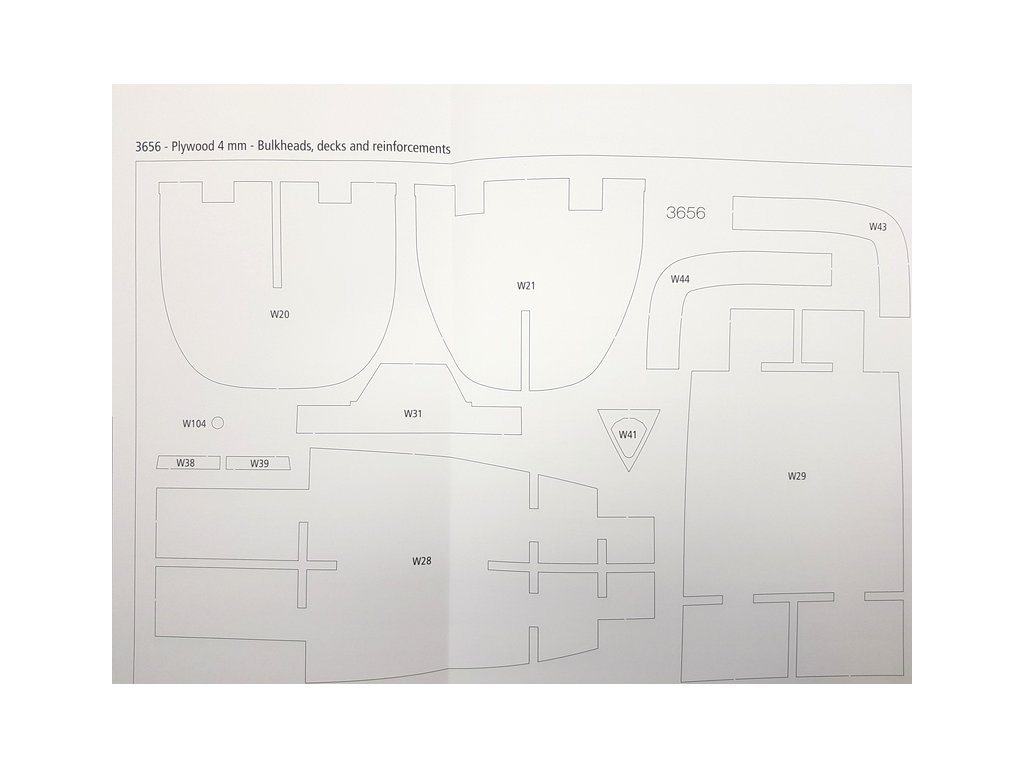 Po otevření víka krabice naleznete dřevěné díly modelu z překližky, sadu lišt, fotoleptané díly, drobné součásti uzavřené v plastovém průhledném blistru, sadu výkresů a manuál.