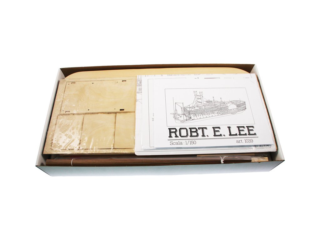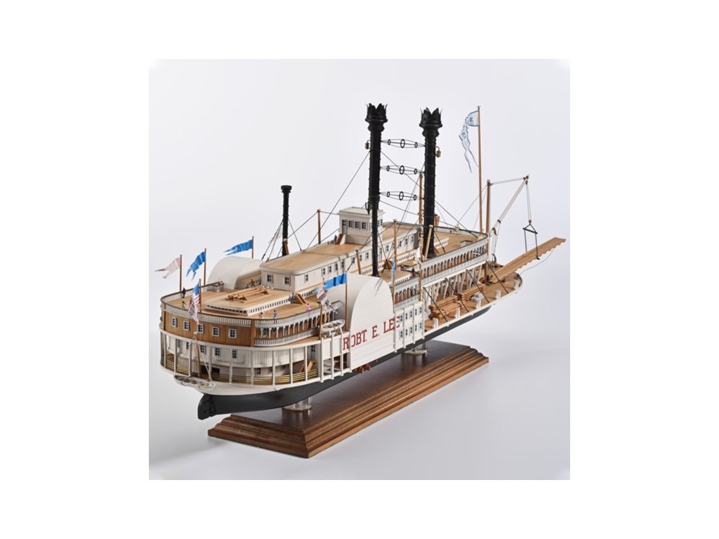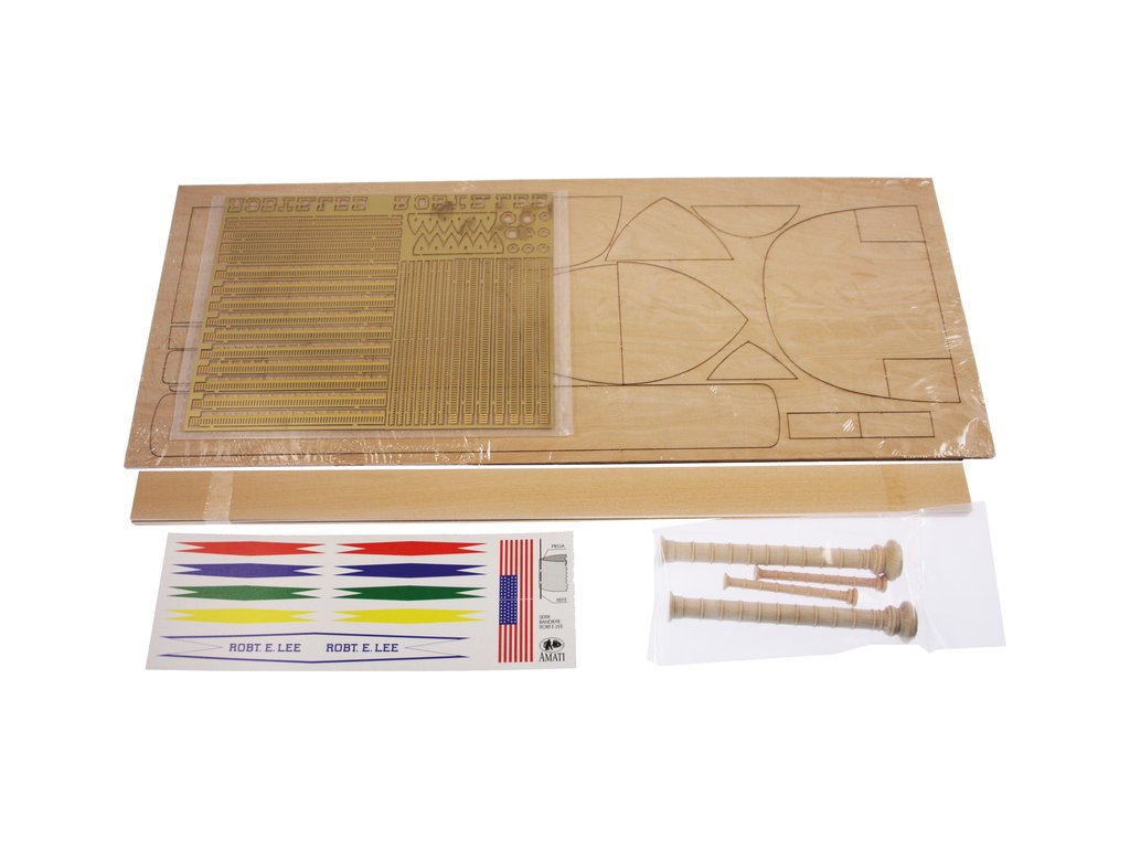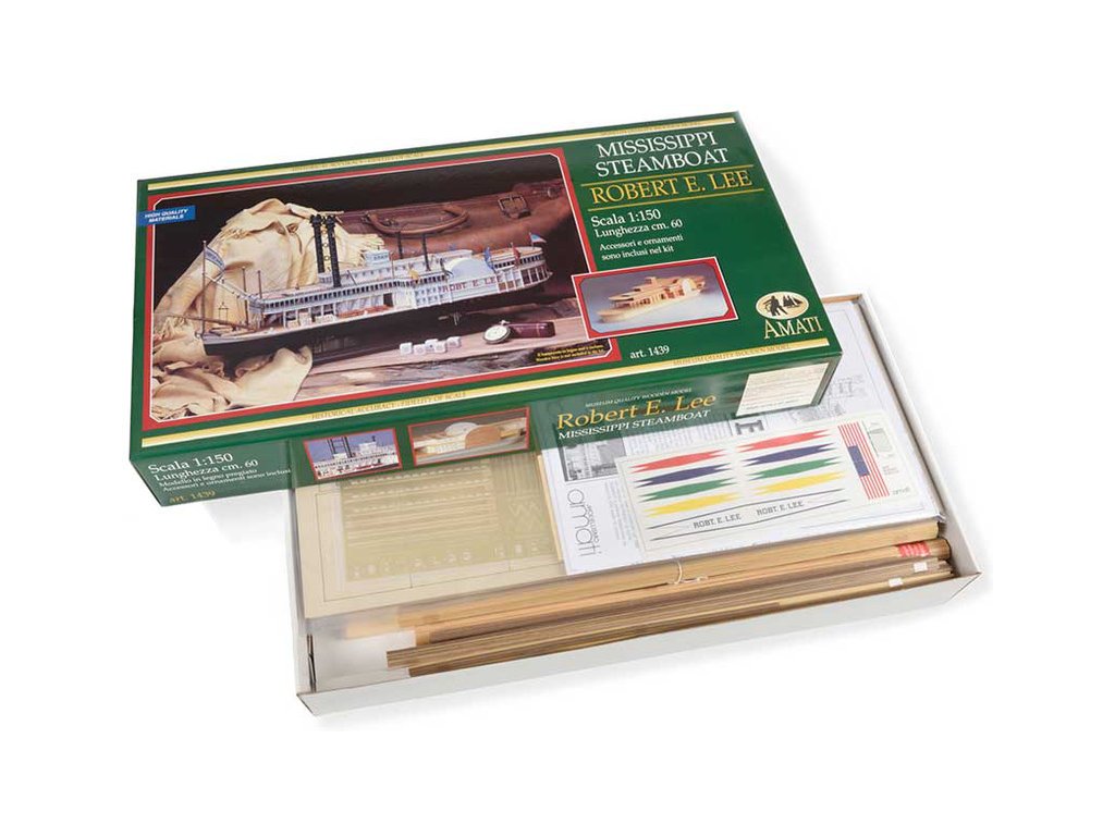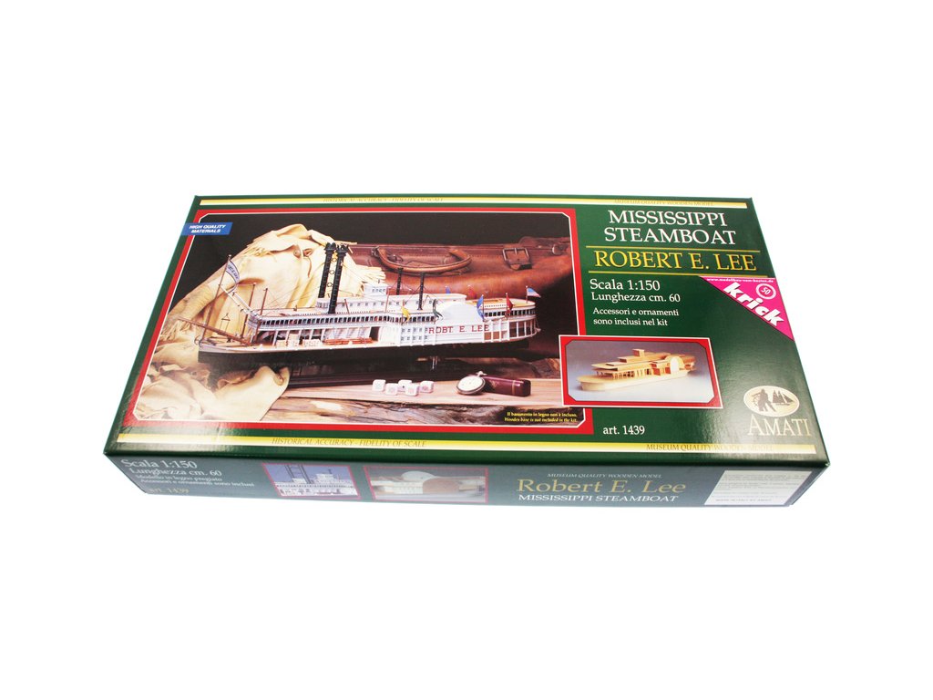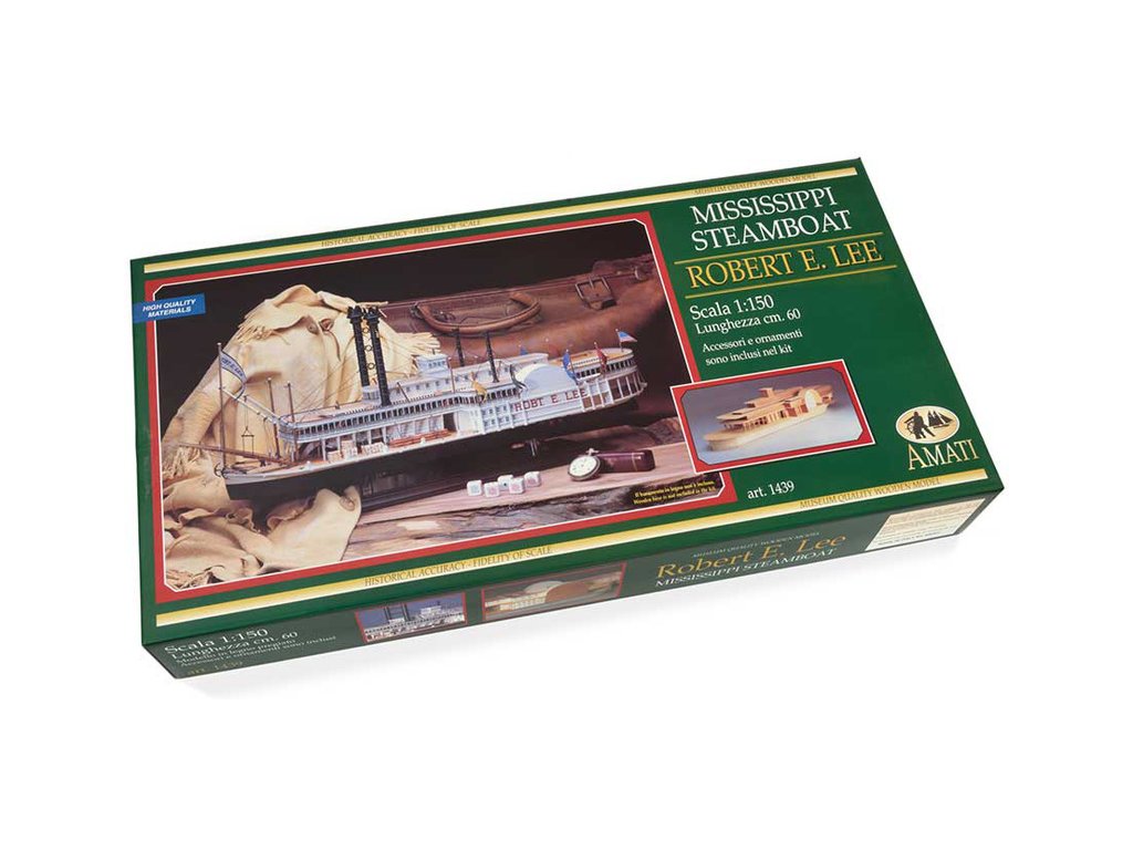Stavebnice statické makety historické lodi AMATI Robert E. Lee 1870 1:150 kit. První hlavní silnice v Americe byly velké řeky, které umožnily růst obchodu a dopravy. Loď Robert E. Lee byl říční parník. Dřevěné díly jsou řezány laserem, obsaženy jsou mosazné leptané díly, kování, doplňky.
