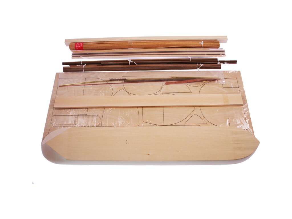 Balení obsahuje sadu překližkových dílů, sadu dřevěných lišt o různém průřezu, blistr s drobnými díly, sadu výkresů a vícejazyčný manuál.