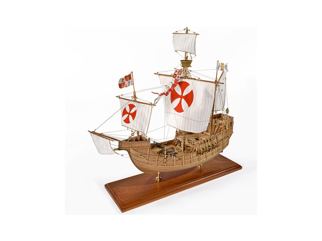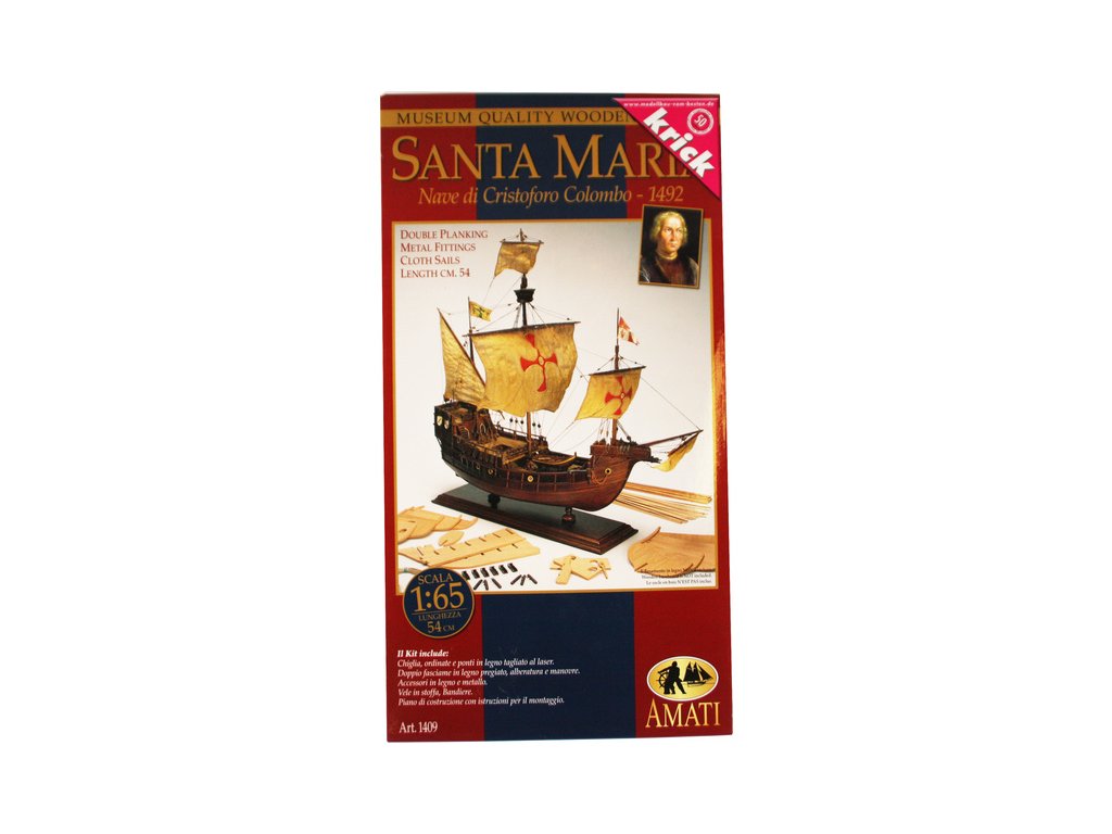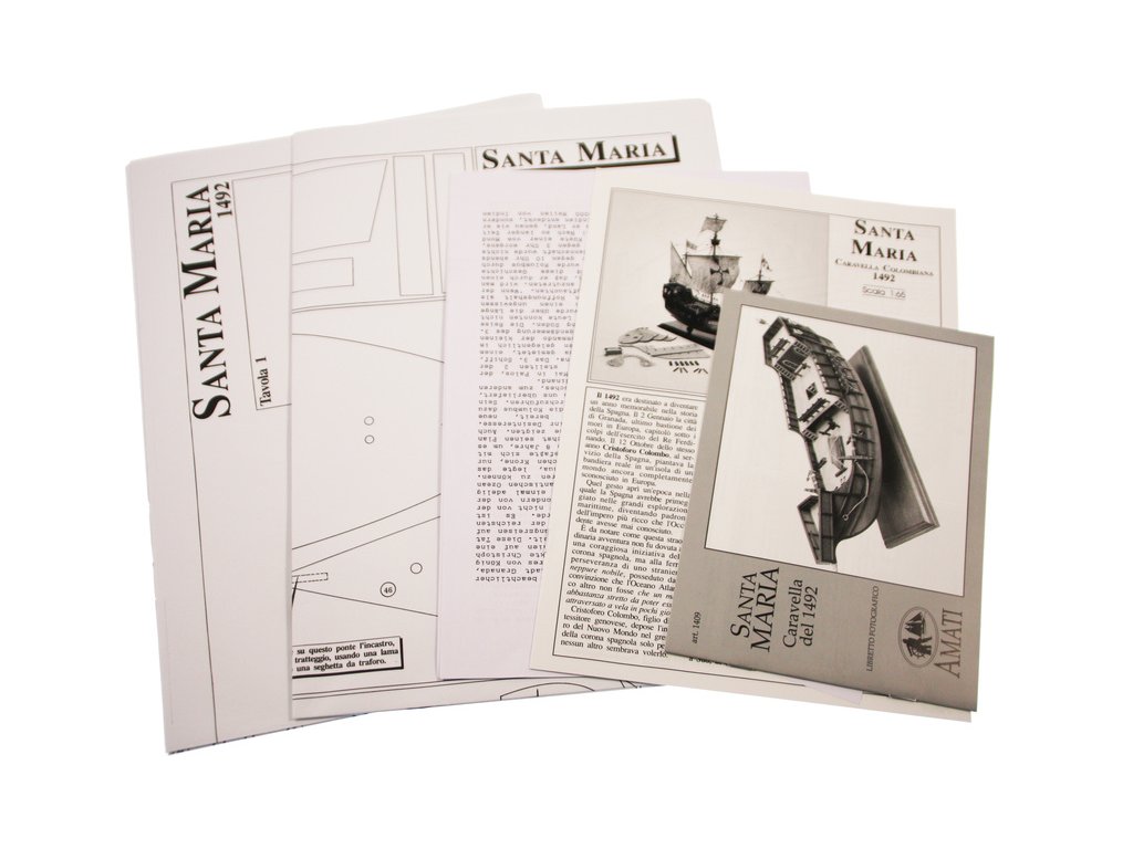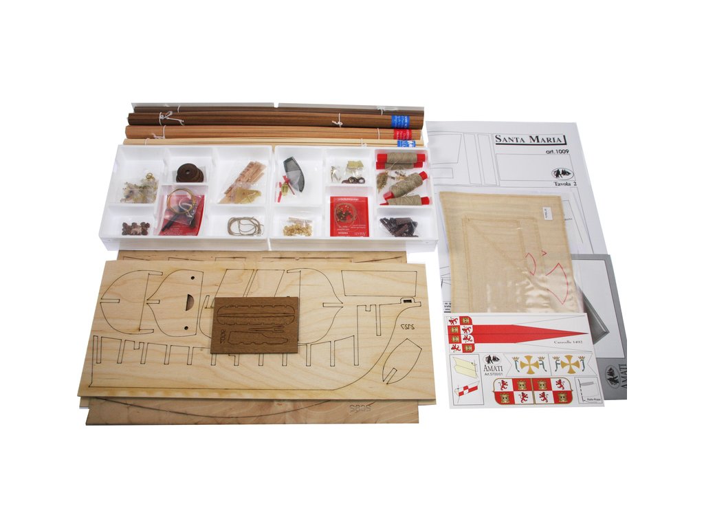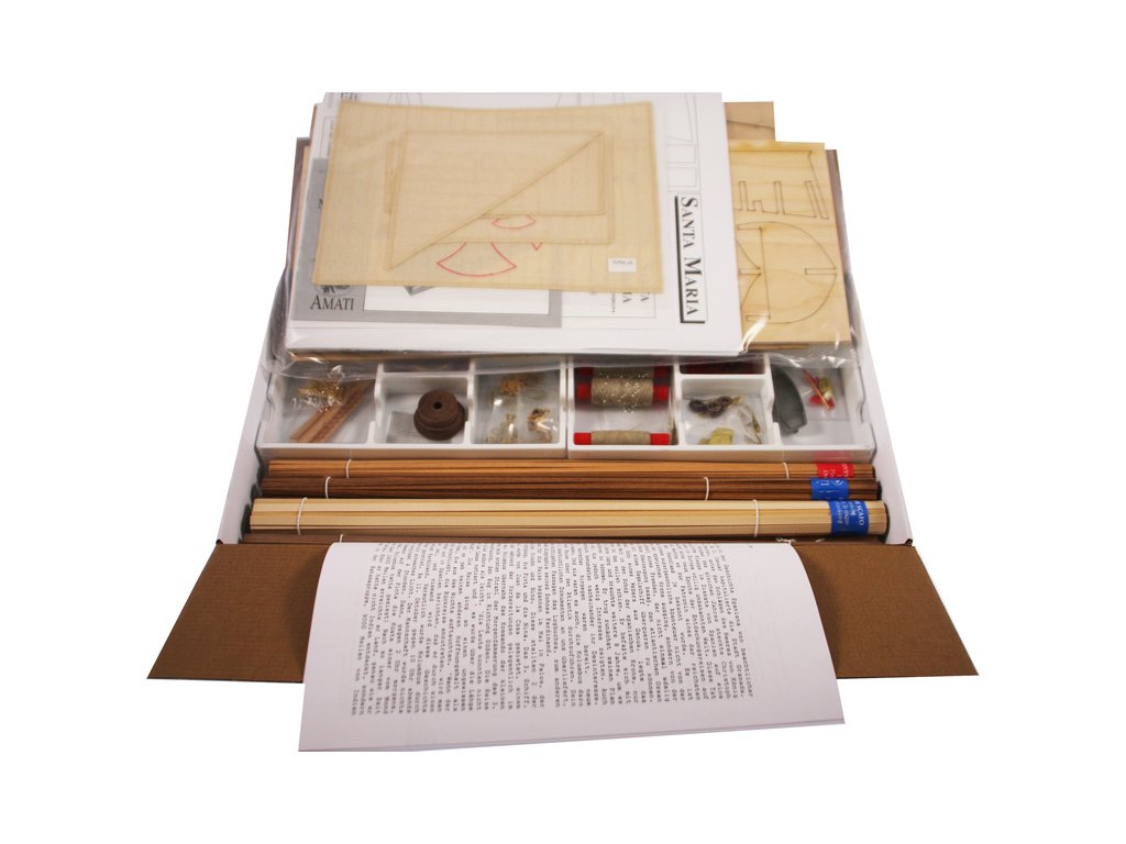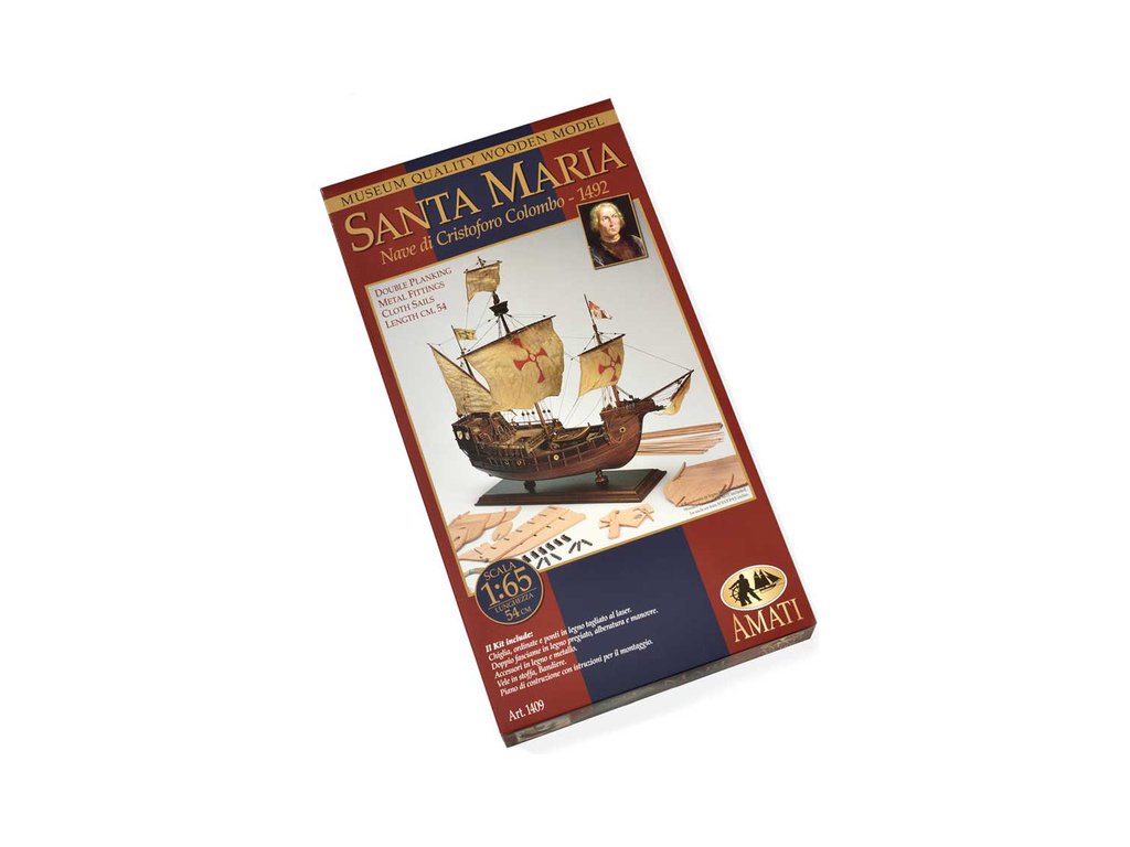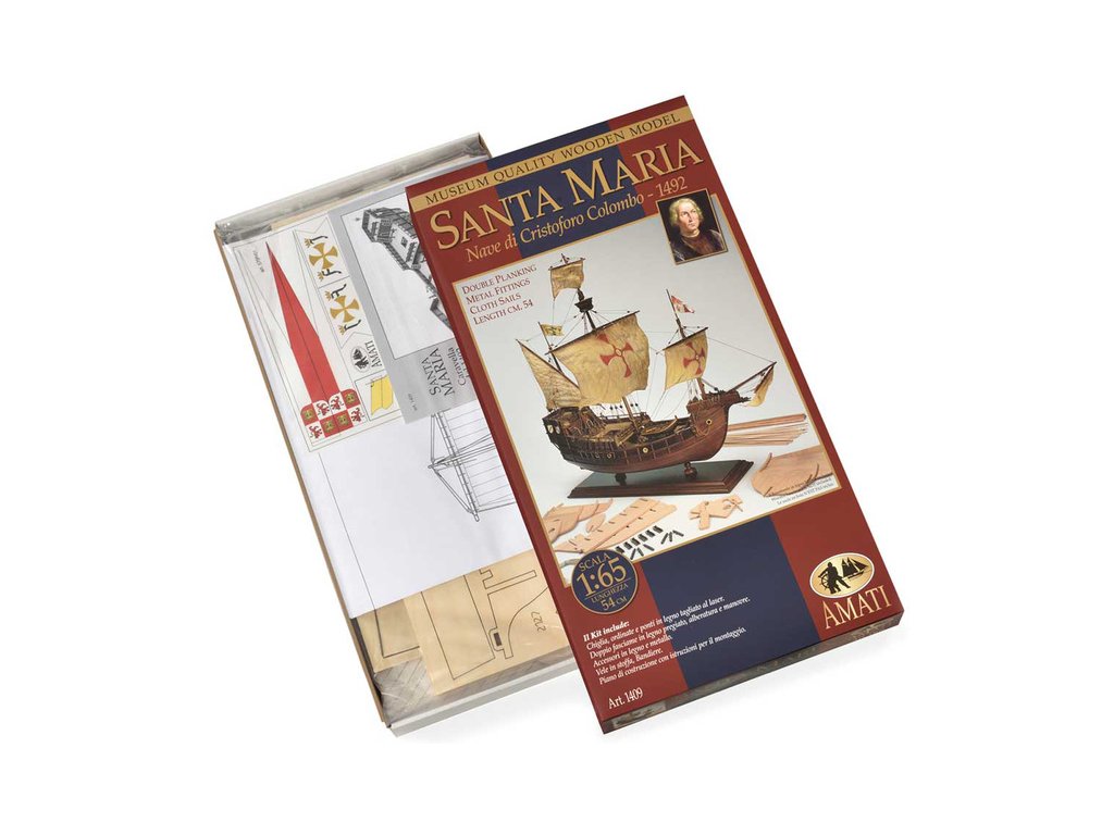 Stavebnice statické makety lodi, AMATI Santa Maria karavela z roku 1492 v měřítku 1:65 kit. Jedna ze tří lodí, s nimiž Columbus objevil Ameriku a je stále jednou z nejslavnějších lodí v historii námořnictva. Dřevěné díly jako kýl a obšívka jsou řezány laserem, obsahuje plachty, lanoví, stožáry, kování. Dekorace jsou vyrobeny ze zlaceného litého kovu. Tři stavební plány