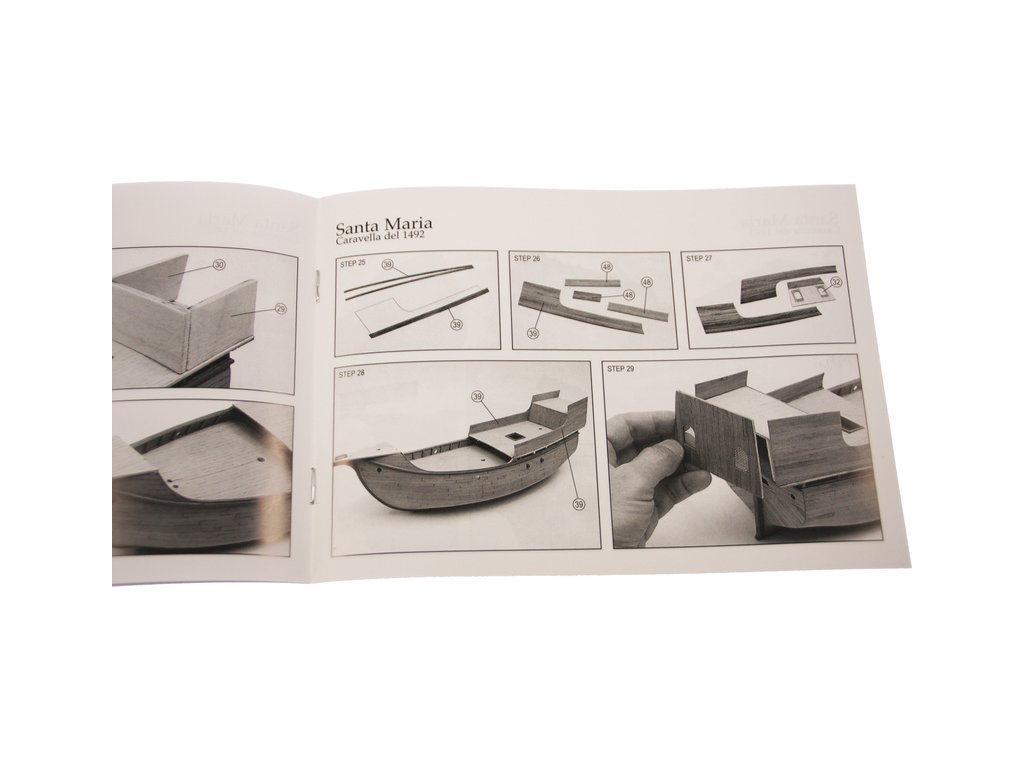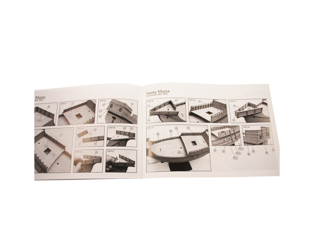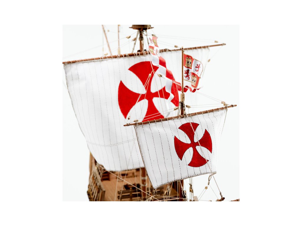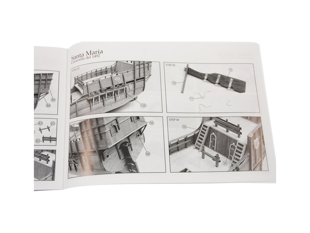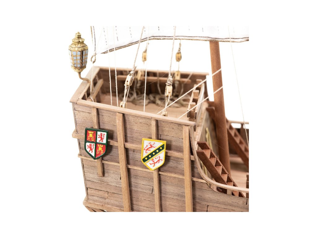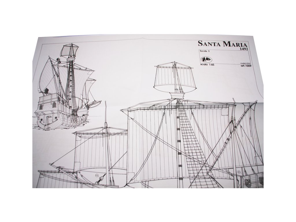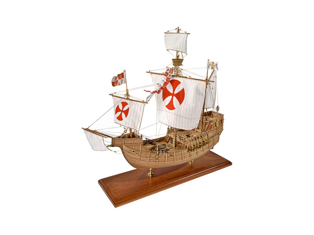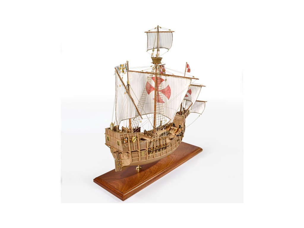 Stavebnice statické makety lodi, AMATI Santa Maria karavela z roku 1492 v měřítku 1:65 kit. Jedna ze tří lodí, s nimiž Columbus objevil Ameriku a je stále jednou z nejslavnějších lodí v historii námořnictva. Dřevěné díly jako kýl a obšívka jsou řezány laserem, obsahuje plachty, lanoví, stožáry, kování. Dekorace jsou vyrobeny ze zlaceného litého kovu. Tři stavební plány