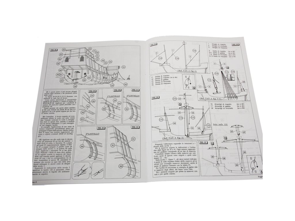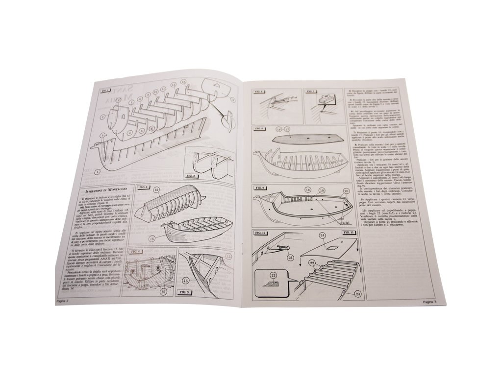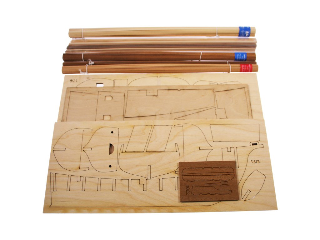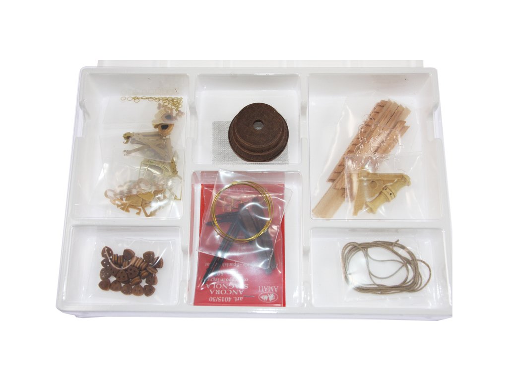 Balení obsahuje sadu překližkových dílů, sadu dřevěných lišt o různém průřezu, blistr s drobnými díly, sadu výkresů, německý a italský manuál s obrázkovým postupem, český návod ke stavbě.