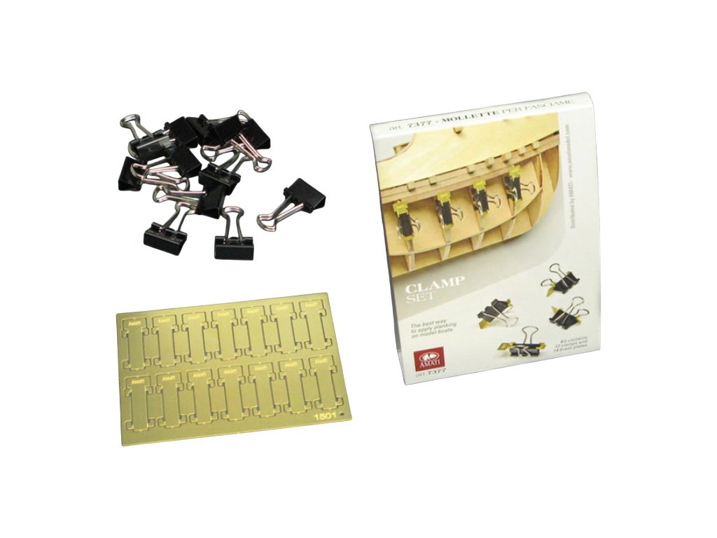 Praktická sada 12 svorek s držáky usnadňující plaňkování trupů dřevěných modelů lodí. Svěrky umožňují bezpečné a přesné přichycení lišty ke každému žebru během lepení.
