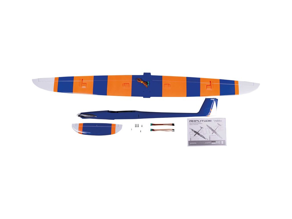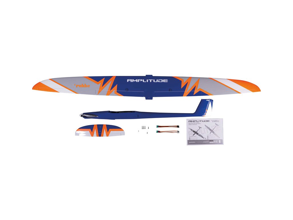 V balení je RC model Amplitude 1.8m s nainstalovanými komponenty: střídavý motor Robbe X36-800, 5x servo Robbe FS-155 BB MG HV, prodlužovací kabely s konektory MPX-JR, kužel 38mm, sklopná vrtule 12x8“ CAM. Manuál EN, DE, FR.