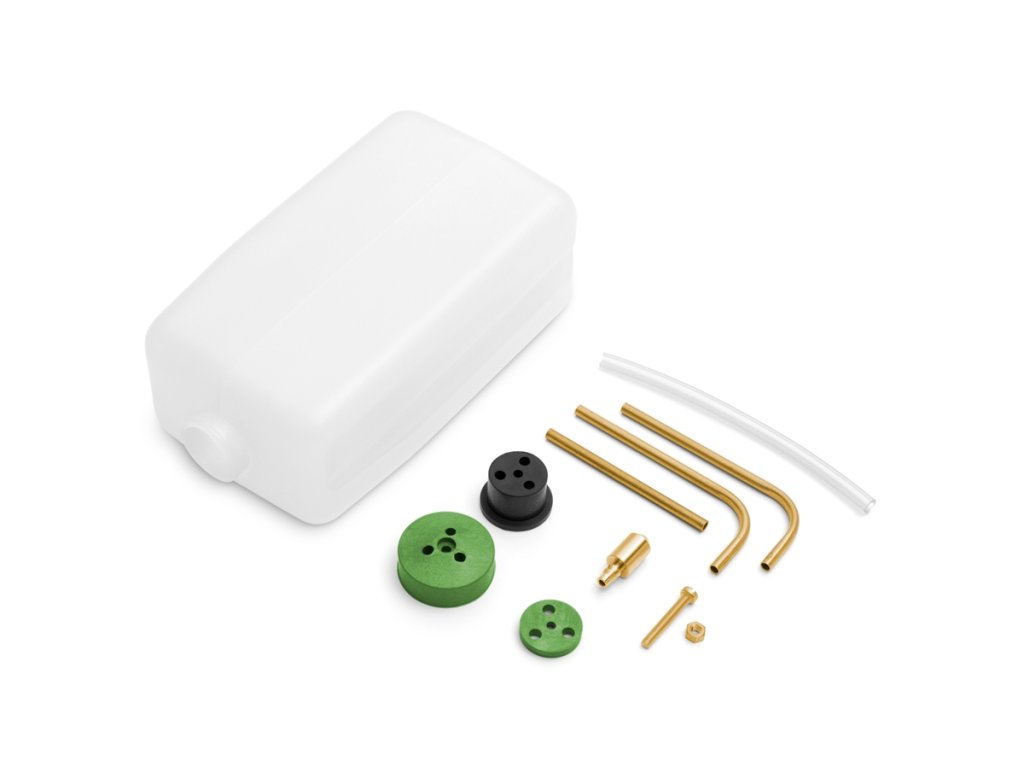 Lehká ale pevná nylonová nádrž 340 ml pro žhavící palivo s odolným víčkem, gumovou zátkou a opěrnou deskou. Předohýbané mosazné fitinky a sací závaží, silikonová hadička. Rozměry (bez hrdla a víčka): 121x69x48 mm, hmotnost: 47g.Doplňkové parametry