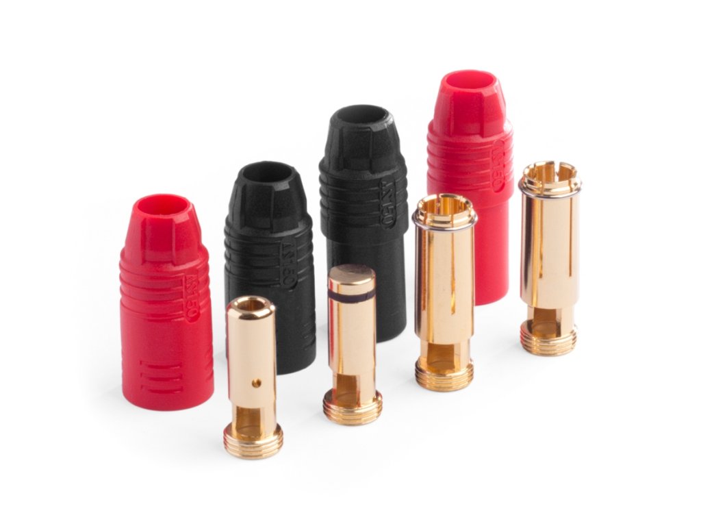Silový konektor v "protijiskřící" úpravě se zlacenými kontakty se zatížitelností max. 150 A (70A dlouhodobě). Pro kabely o průřezu max. 13,3 mm2 (6AWG). Přechodový odpor 0,20 mOhm, max. 500 V. Balení 2 páry kontaktů s pouzdry v barvě červené a černé.Doplňkové parametry