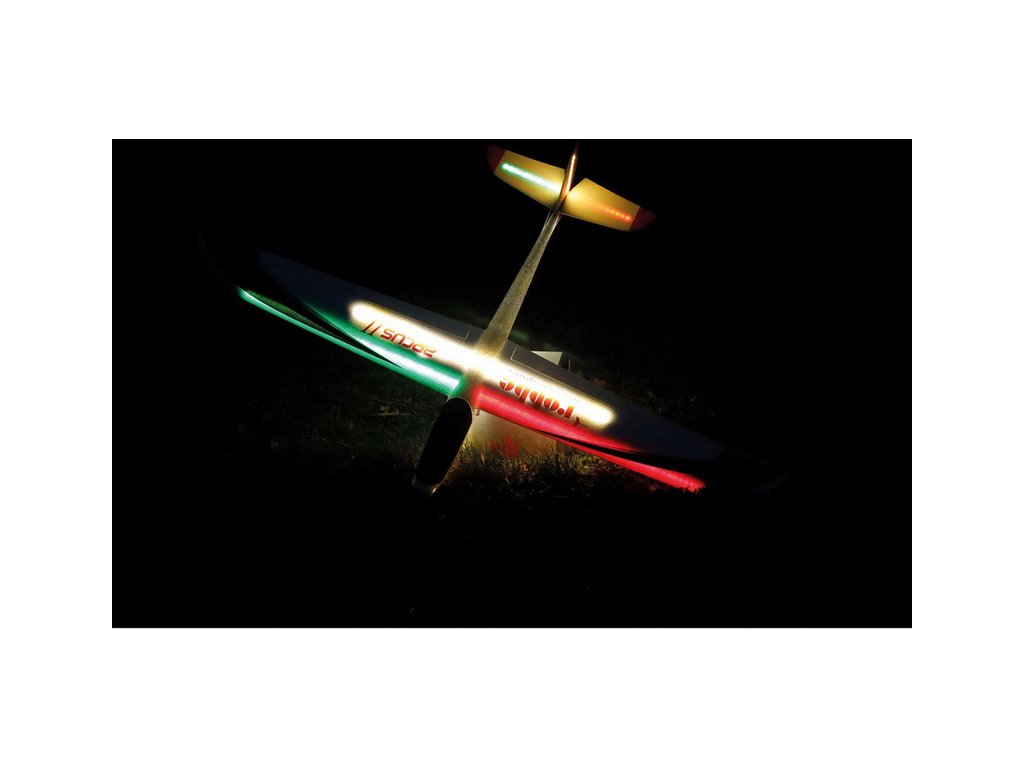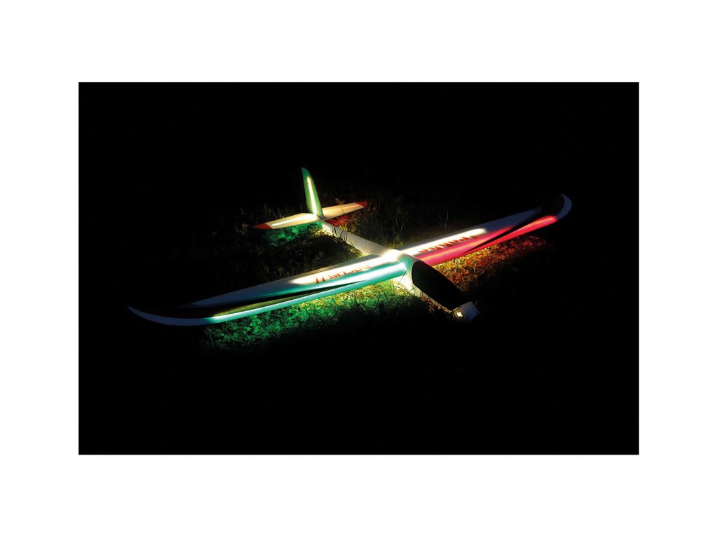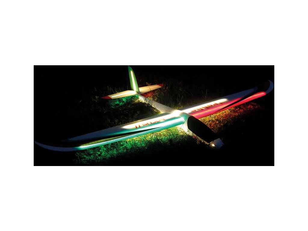 RC model větroně s pomocným motorem, ARCUS II Night PNP o rozpětí 1,8m s elektronikou, pohonem (bez přijímače) a barevným LED osvětlením. Model pro začínající i pokročilé, k učení i zábavě je skladný, má dvoudílné křídlo a výkonný střídavý motor. Doporučena je 4+ kanálová RC souprava a LiPol baterie 11,1V 1300mAh.