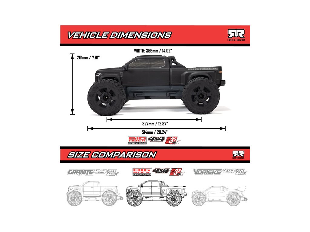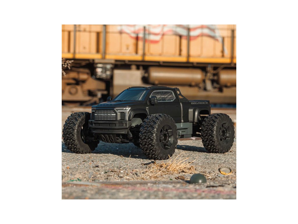 RC model auta Arrma Big Rock 223S BLX typu Monster truck s náhonem 4WD, nezávislým zavěšením, olejovými tlumiči a výkonným střídavým pohonem, dosáhne rychlosti až 80 km/h. To vše za dostupnou cenu pro takto výkonný model. Výborné jízdní vlastnosti zajišťuje pohon všech kol se středovým a nápravovými diferenciály. Obsažena je exkluzivní stabilizace jízdy DSC. RC auto je určeno pro děti, dospělé, začátečníky i zkušené jezdce, kteří získají hotový, odolný a rychlý model. Bezsponková karoserie s dlouhou korbou je ztělesněním agresivního stylu nákladních pick-up vozidel.