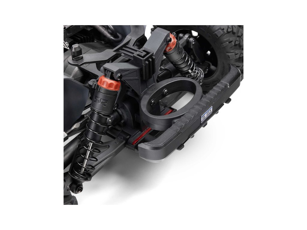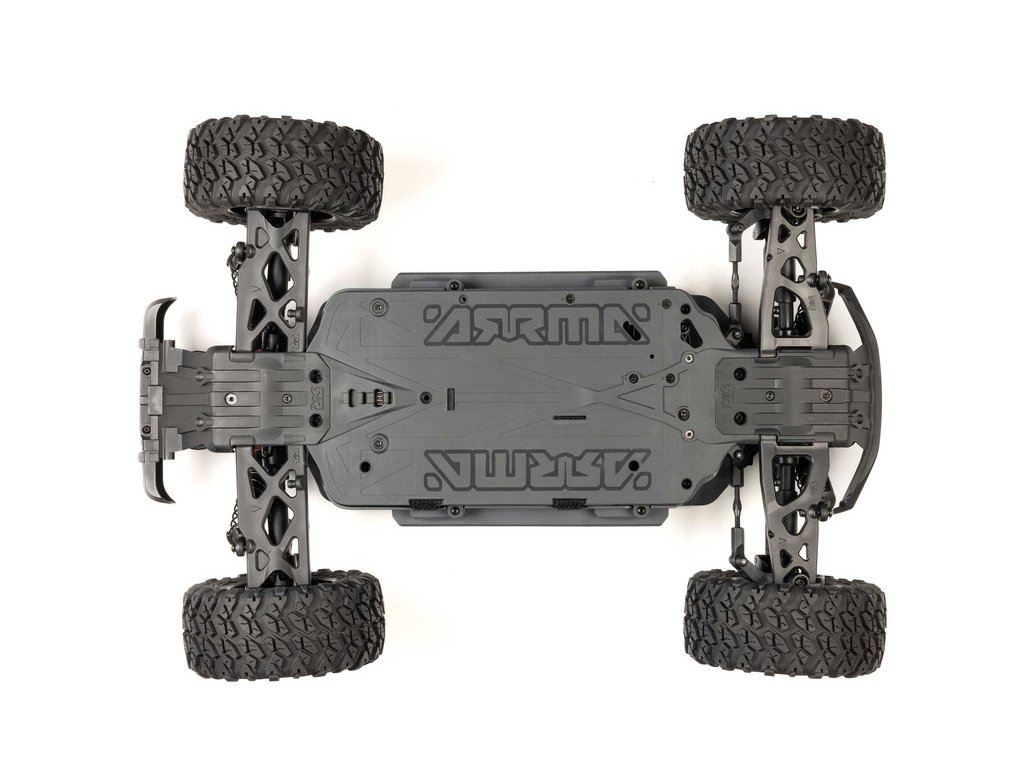 Osvědčená odolná platforma ARRMA® 4X4, vám umožní jezdit vysokou rychlostí téměř v jakémkoli prostředí - v terénu, na šotolině a trávě, na parkovištích i po zpevněných a asfaltových površích. Odolnost šasí vychází ze silného kompozitového podvozku, s prodlouženou výškou chráničů nečistot. Použité kovové převody jsou dostatečně odolné pro střídavý pohon. Výkon je distribuován na jednotlivá kola pomocí přední, zadního a středového diferenciálu. Maximální trakci zajišťují osvědčené pneumatiky dBoots. Vysílač Spektrum SLT poskytuje bezpečný provoz bez výpadků, pro bezstarostnou jízdu jsou na modelu použity voděodolné* komponenty - regulátor s přijímače Spektrum 2-v-1 80A a servo řízení Spektrum S662 s vysokým točivým momentem a kovovými převody.