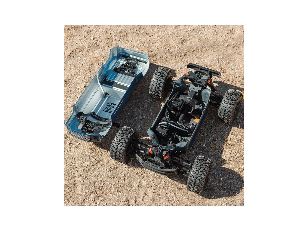 Osvědčená odolná platforma ARRMA® 4X4, vám umožní jezdit vysokou rychlostí téměř v jakémkoli prostředí - v terénu, na šotolině a trávě, na parkovištích i po zpevněných a asfaltových površích. Odolnost šasí vychází ze silného kompozitového podvozku, s prodlouženou výškou chráničů nečistot. Použité kovové převody jsou dostatečně odolné pro střídavý pohon. Výkon je distribuován na jednotlivá kola pomocí přední, zadního a středového diferenciálu. Maximální trakci zajišťují osvědčené pneumatiky dBoots. Vysílač Spektrum SLT poskytuje bezpečný provoz bez výpadků, pro bezstarostnou jízdu jsou na modelu použity voděodolné* komponenty - regulátor s přijímače Spektrum 2-v-1 80A a servo řízení Spektrum S662 s vysokým točivým momentem a kovovými převody.