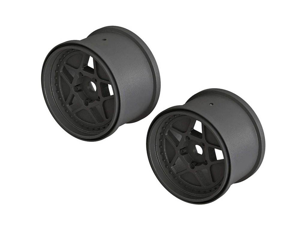 Náhradní díl pro RC modely aut Arrma Kraton/Outcast 4S BLX: disk kola 3.8" černý (2 ks). Rozměry 97x71mm, šestihran 17mm.