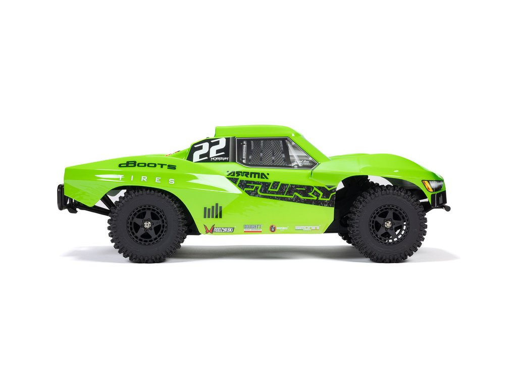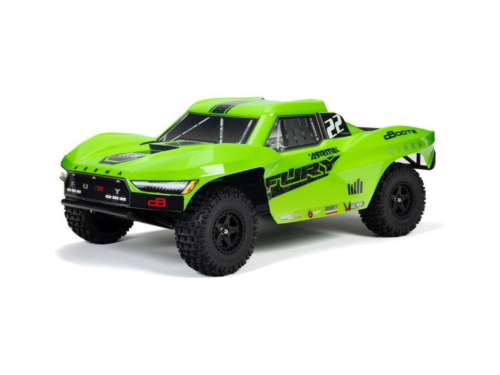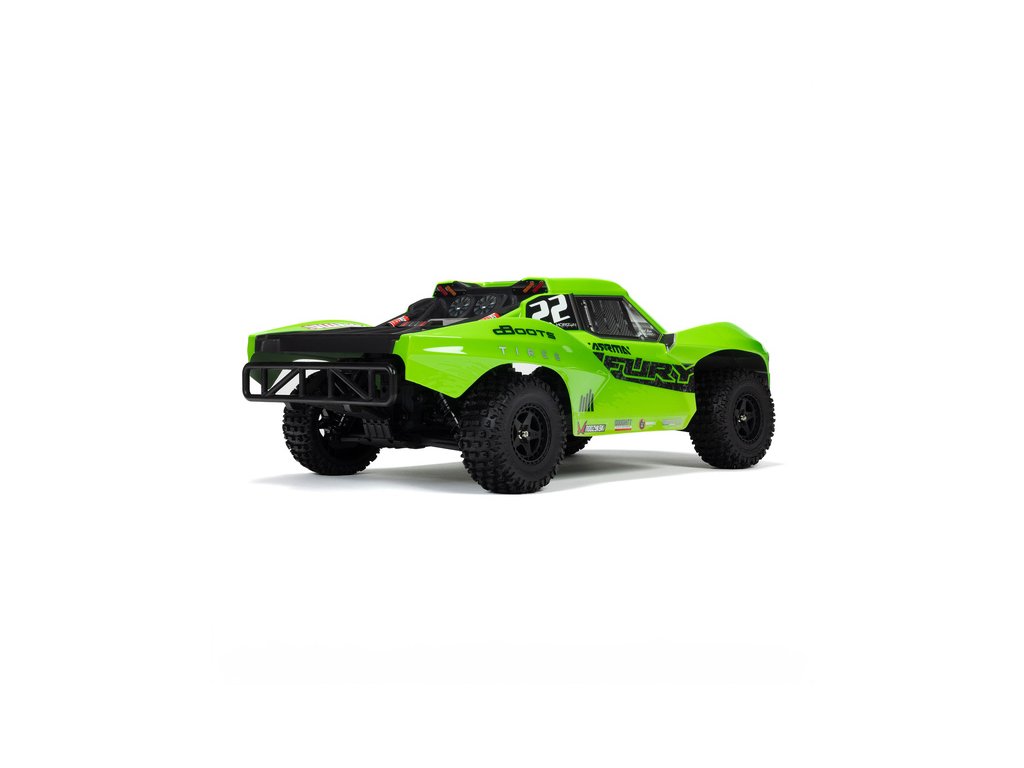 RC model Arrma Fury Mega 550 1:10 RTR Basic je cenově dostupné auto na dálkové ovládání typu Short Course s náhonem 2WD, nezávislým zavěšením, olejovými tlumiči, proporcionálním řízením a stejnosměrným motorem. RC souprava SLT 2.4 GHz.