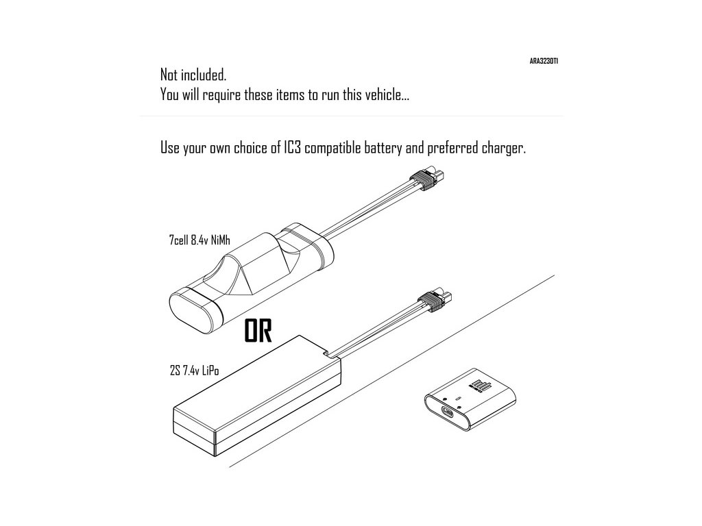Pro provoz modelu je nutné doplnit pohonný akumulátor typu 2S LiPo, nebo 7 čl. NiMH Hump (vysoký) s konektorem IC3 / EC3 a kompatibilní nabíječ.