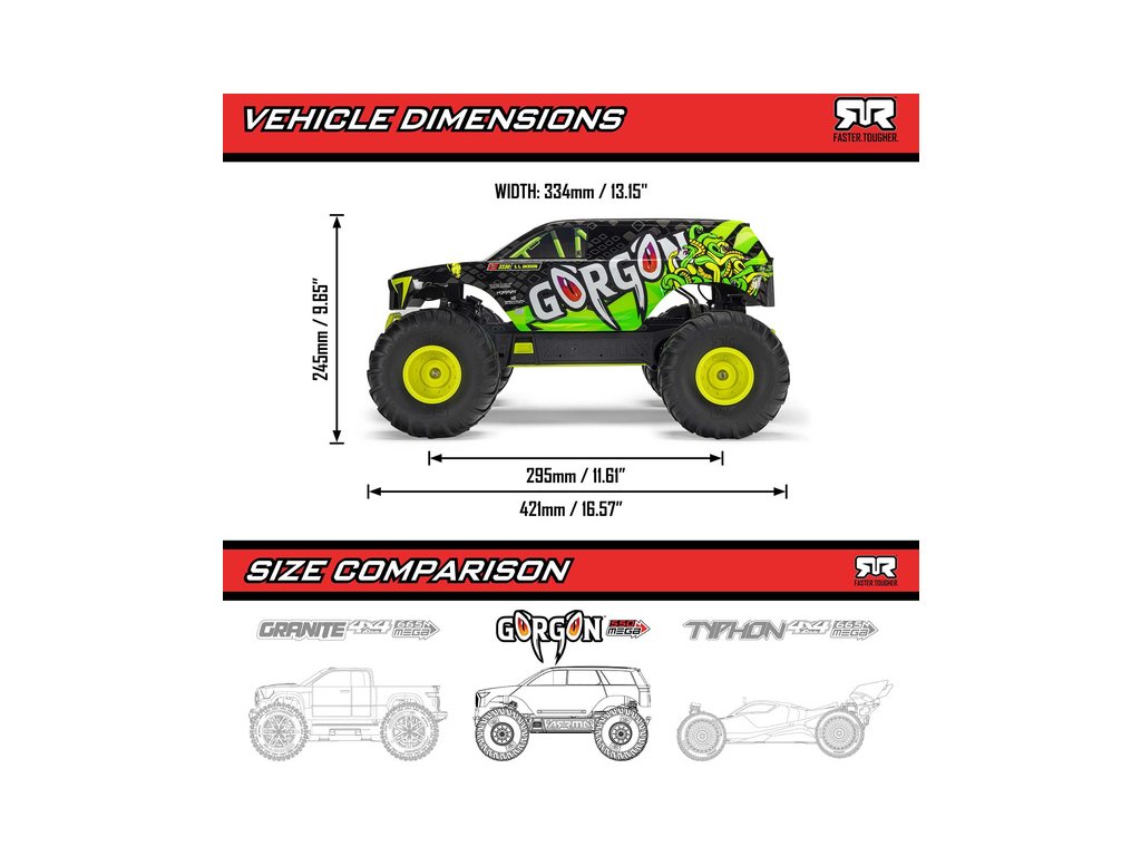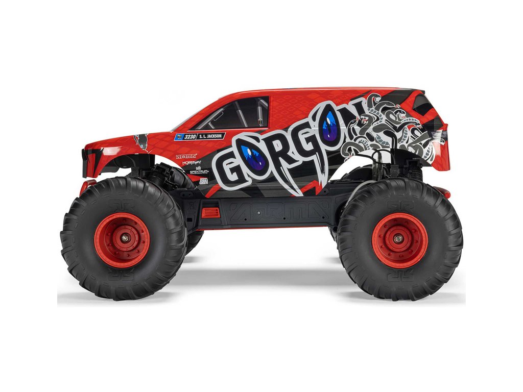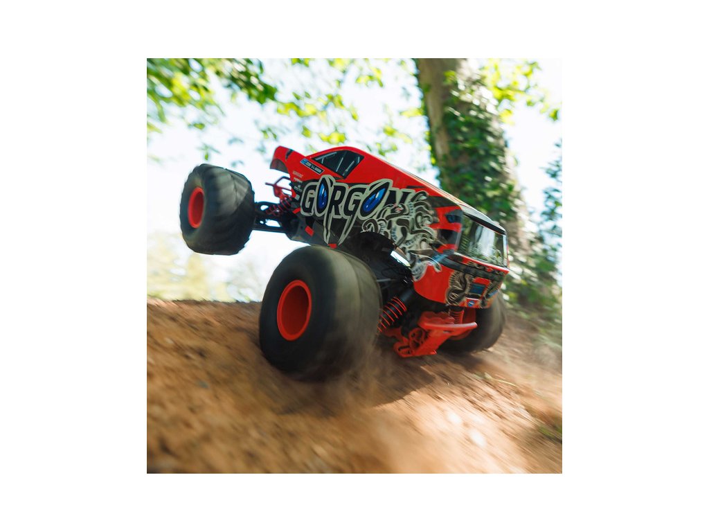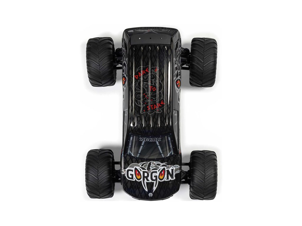 Ihned po vybalení přitáhne Gorgon vaši pozornost díky svému originálnímu vzhledu. Karoserie je z výroby dokončena ve velmi atraktivním moderním stylu a je barevně sladěna s jednotlivými díly šasi, jako jsou pružiny, přihrádka na baterii, kluzné desky a nárazníky. Osvědčená technologie ARRMA má díky kompozitnímu šasi vysokou odolnost. Nezávislé zavěšení, olejové tlumiče a nastavitelná světlá výška zajišťují komfortní jízdu. Pro nezastavitelnou trakci přenáší 2WD převodovka výkon ze stejnosměrného motoru MEGA 550 do masivních pneumatik dBoots ® Chevron o rozměru 130mm, nalepených na nylonových discích 57mm. Použité kovové převody jsou dostatečně odolné i pro případný upgrade na střídavý pohon.