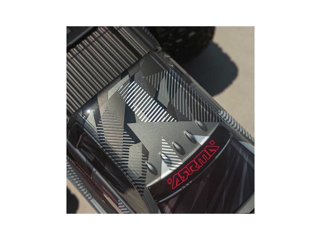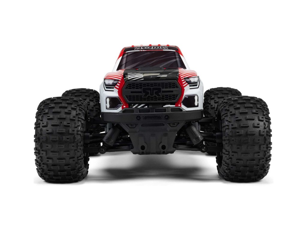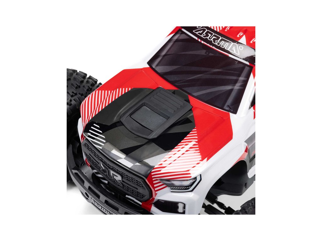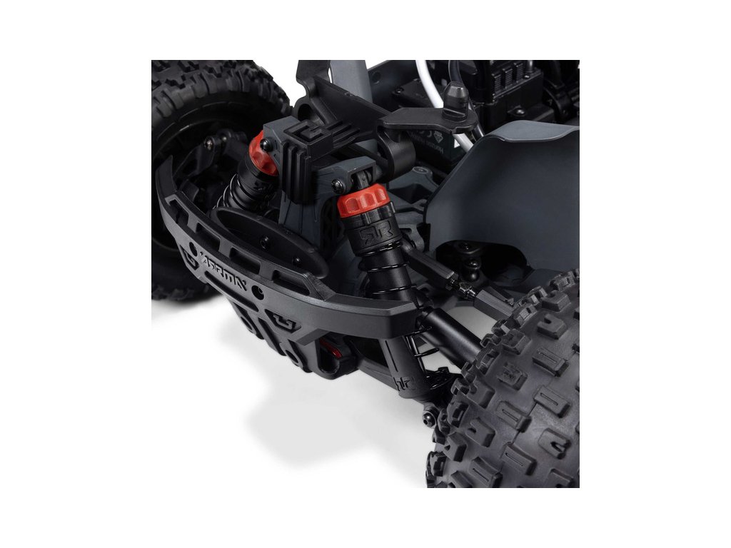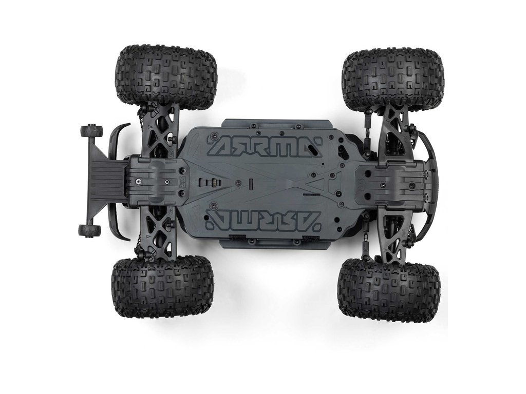 Osvědčená odolná platforma ARRMA® 4X4, vám umožní jezdit vysokou rychlostí téměř v jakémkoli prostředí - v terénu, na šotolině a trávě, na parkovištích i po zpevněných a asfaltových površích. Odolnost šasí vychází ze silného kompozitového podvozku, s prodlouženou výškou chráničů nečistot. Použité kovové převody jsou dostatečně odolné pro střídavý pohon. Výkon je distribuován na jednotlivá kola pomocí přední, zadního a středového diferenciálu. Maximální trakci zajišťují osvědčené pneumatiky dBoots. Vysílač Spektrum SLT poskytuje bezpečný provoz bez výpadků, pro bezstarostnou jízdu jsou na modelu použity voděodolné* komponenty - regulátor s přijímače Spektrum 2-v-1 80A a servo řízení Spektrum S662 s vysokým točivým momentem a kovovými převody.