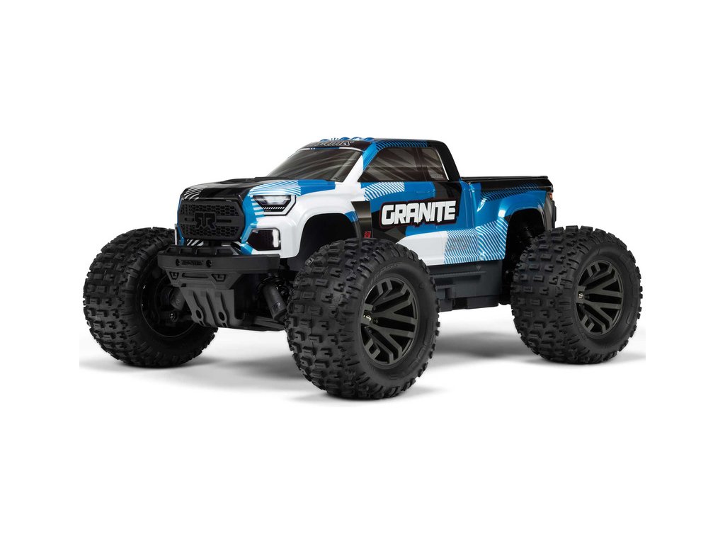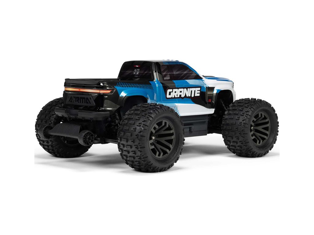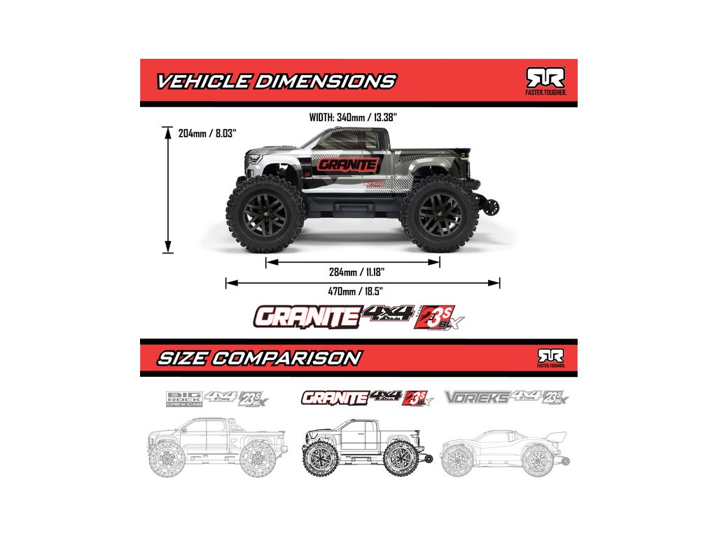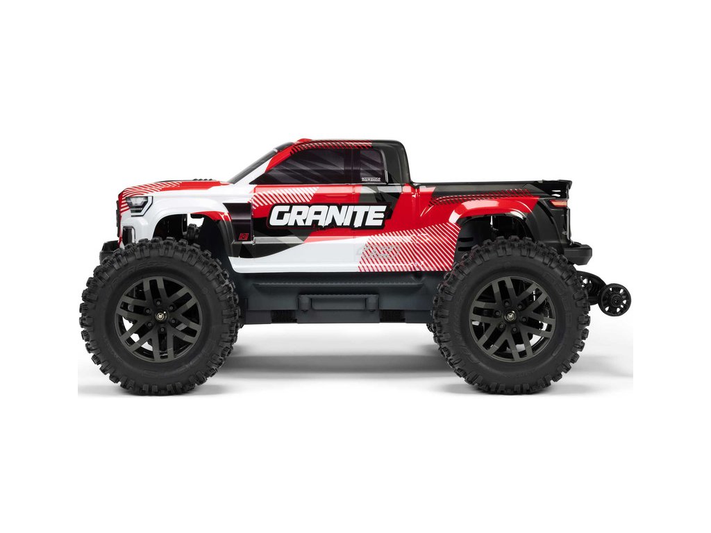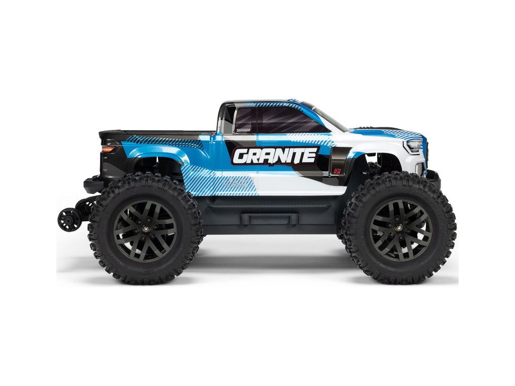 RC model auta Arrma Granite 223S BLX typu Monster truck s náhonem 4WD, nezávislým zavěšením, olejovými tlumiči a výkonným střídavým pohonem, dosáhne rychlosti až 80 km/h. To vše za dostupnou cenu pro takto výkonný model. Výborné jízdní vlastnosti zajišťuje pohon všech kol se středovým a nápravovými diferenciály. Obsažena je exkluzivní stabilizace jízdy DSC. RC auto je určeno pro děti, dospělé, začátečníky i zkušené jezdce, kteří získají hotový, odolný a rychlý model. To vše s agresivním vzhledem karoserie se skrytým bezsponkovým systémem uchycení.
