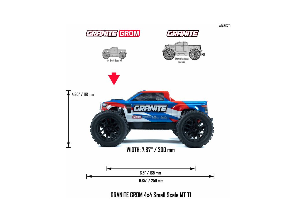 ARRMA GRANITE GROM 4X4 Monster Truck 1:18 RTR je navržen a vyroben podle stejně vysokých standardů, odolnosti a výkonů, jaké očekáváte od RC aut ARRMA. Je jen o něco menší!