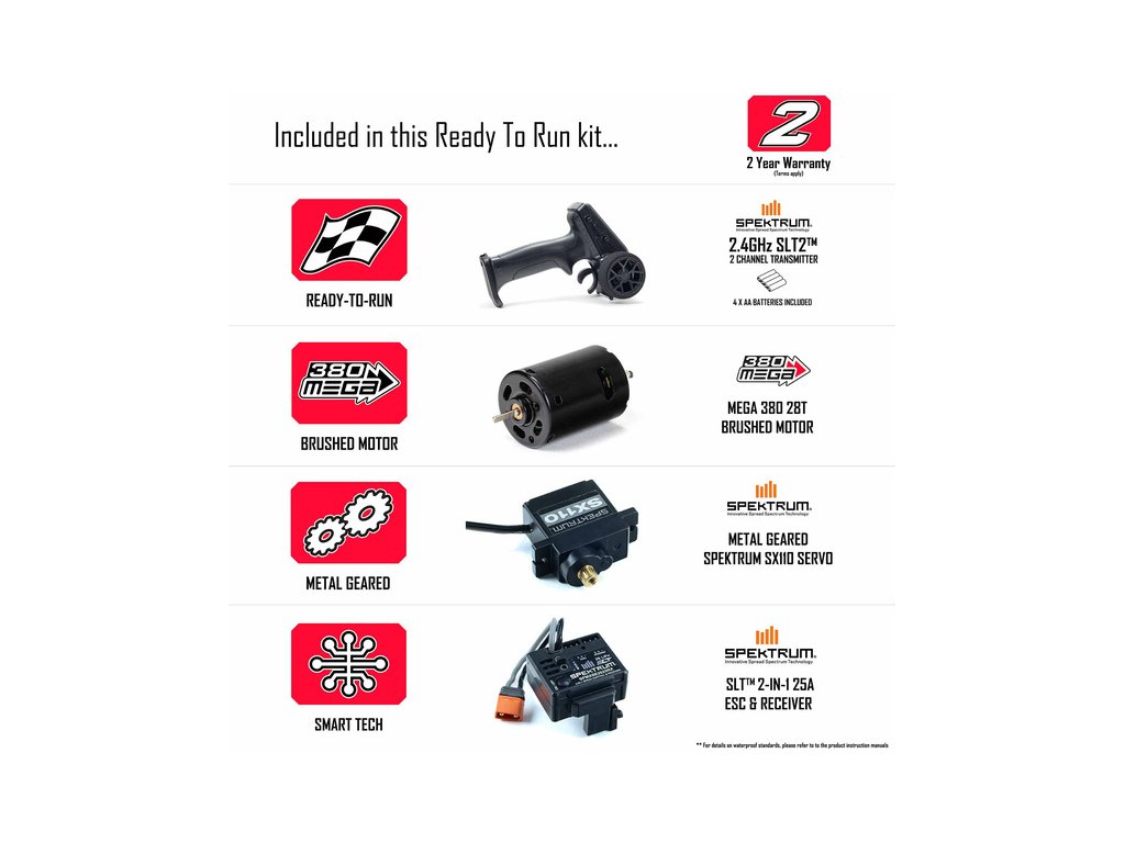 Pro spolehlivé řízení je nainstalováno servo řízení Spektrum™ SX110 s kovovými převody, přijímač v modelu je Spektrum SLT™ 2-v-1.