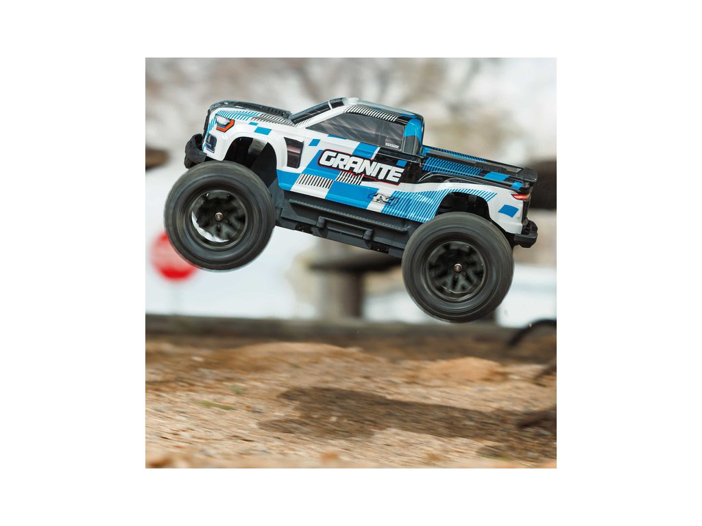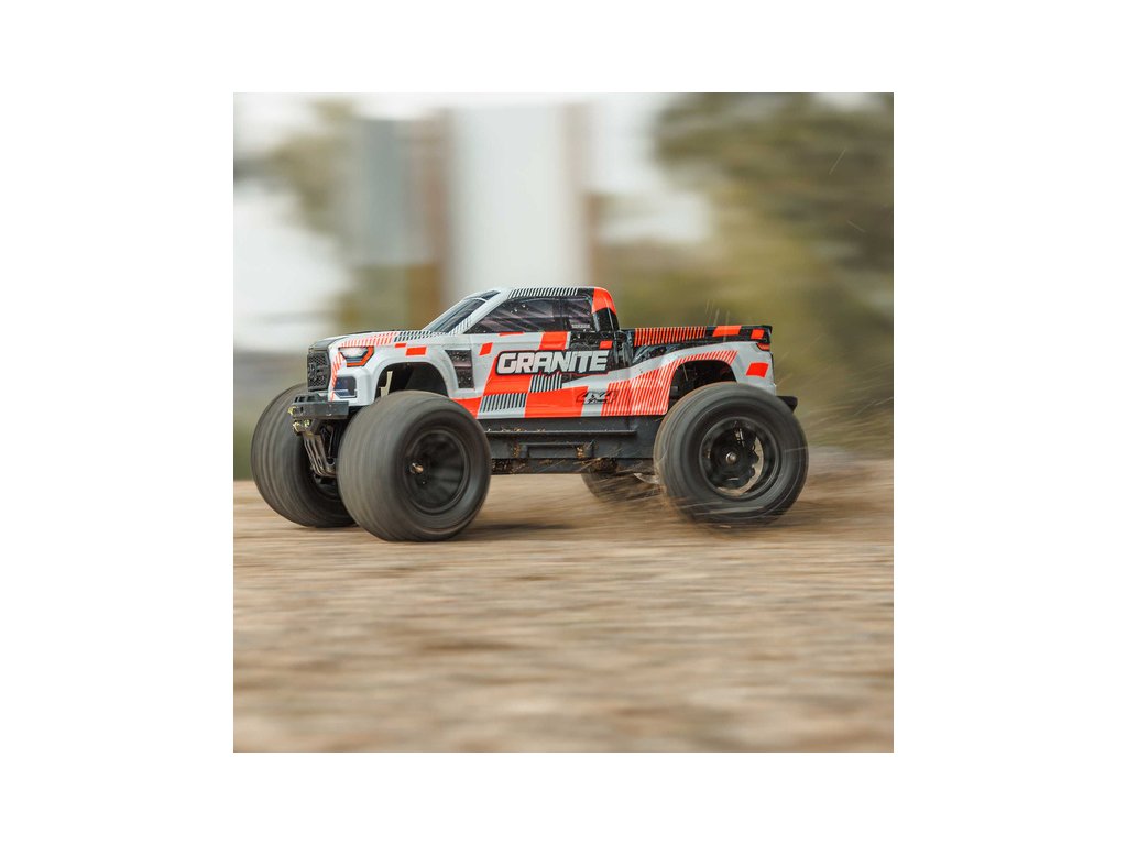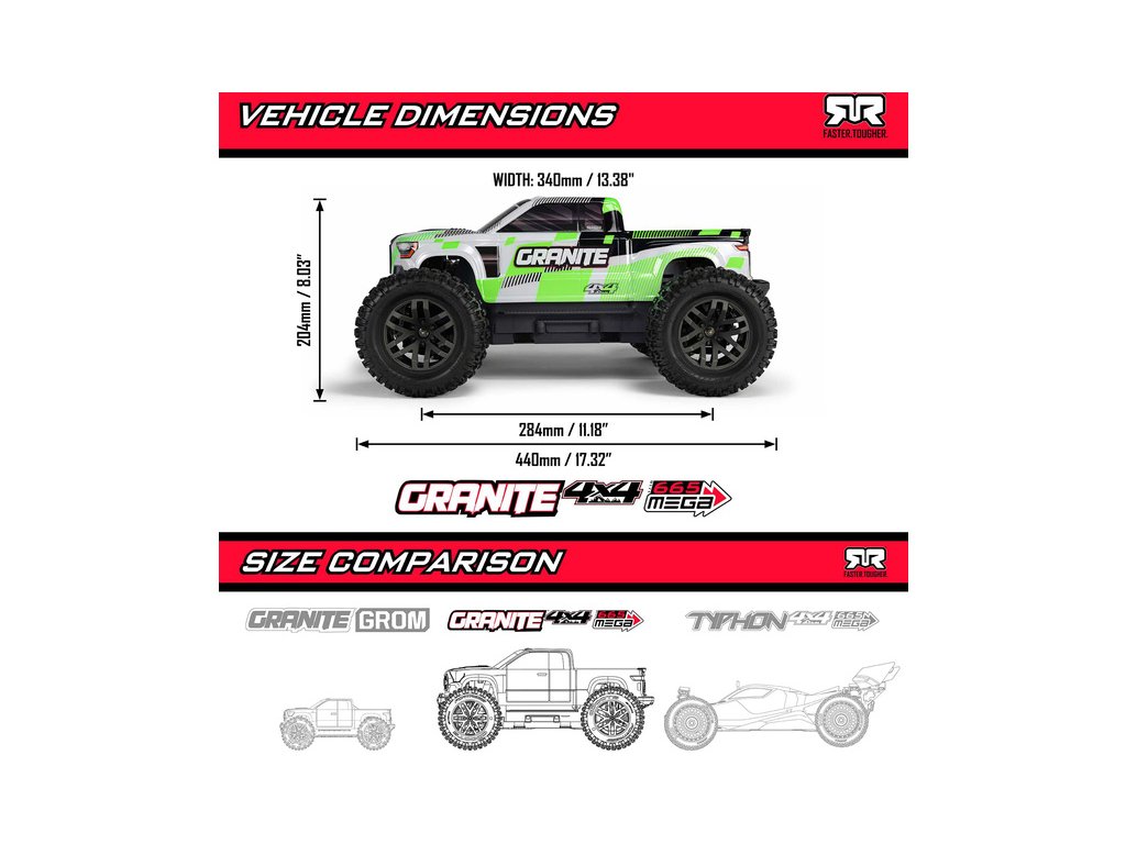 RC model auta Arrma Granite Mega v měřítku 1:10 s pohonem 4x4. Dosahuje rychlosti až 32 km/h. Odolné šasi s kluznými deskami a zvýšenými bočnicemi. Robustní diferenciály s kovovými převody. Nadrozměrný o 11% větší stejnosměrný motor 665. Olejové tlumiče. RC souprava Spektrum SLT2.