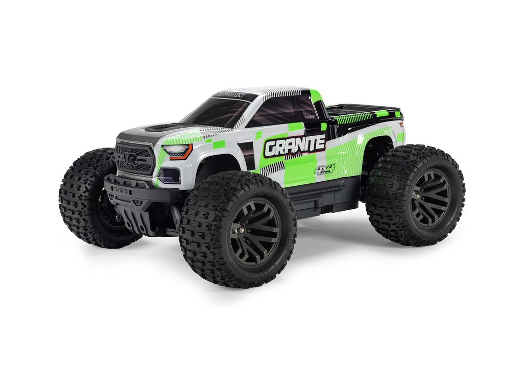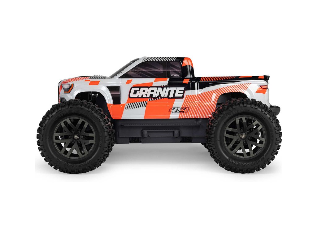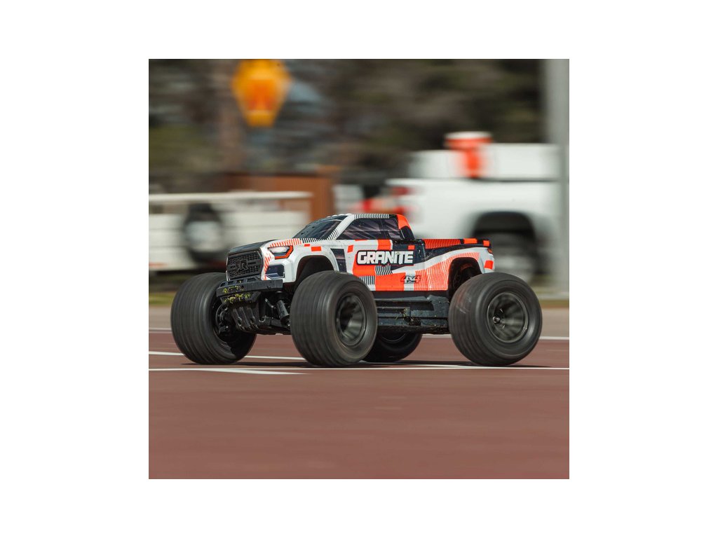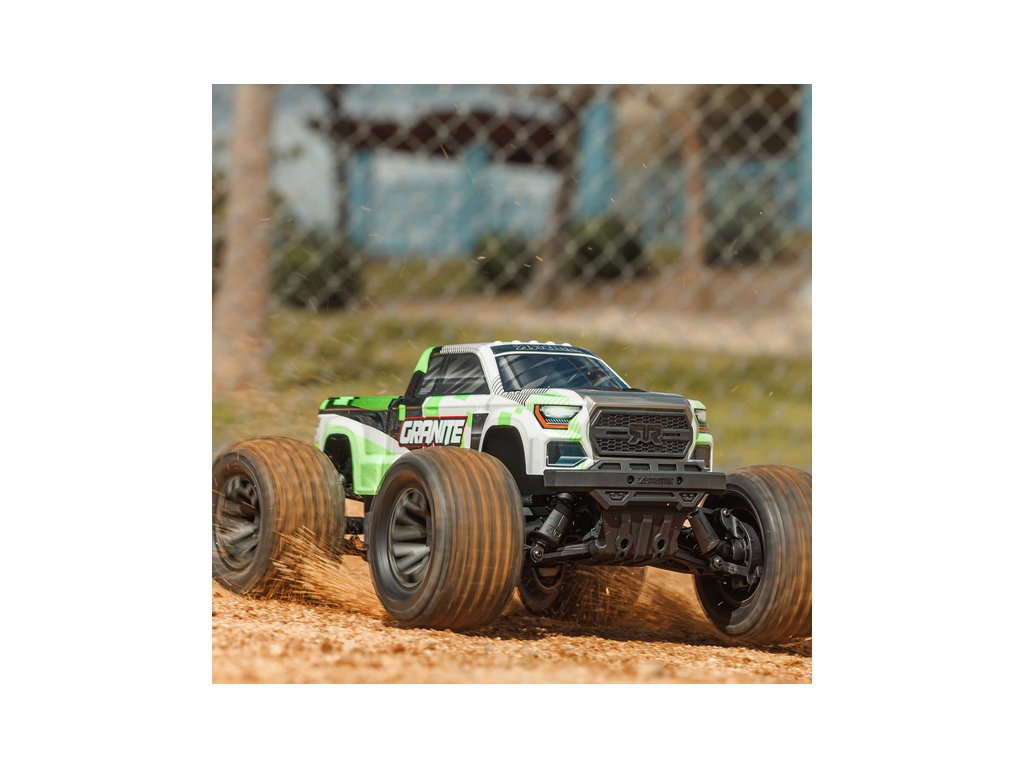 RC model auta Arrma Granite Mega v měřítku 1:10 s pohonem 4x4, ideální pro děti a začátečníky, který nabízí extra točivý moment ihned po vybalení, díky o 11% většímu stejnosměrnému motoru 665 (High Torque). Dosahuje rychlosti až 32 km/h. Odolné šasi s kluznými deskami a zvýšenými bočnicemi proti vnikání nečistot. Robustní diferenciály s kovovými převody. Olejové tlumiče. Bezsponková karoserie pro snadnou výměnu akumulátoru. RC souprava Spektrum SLT2.