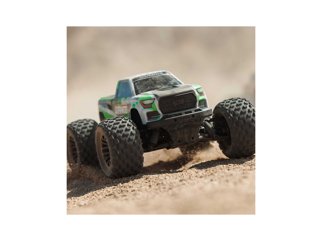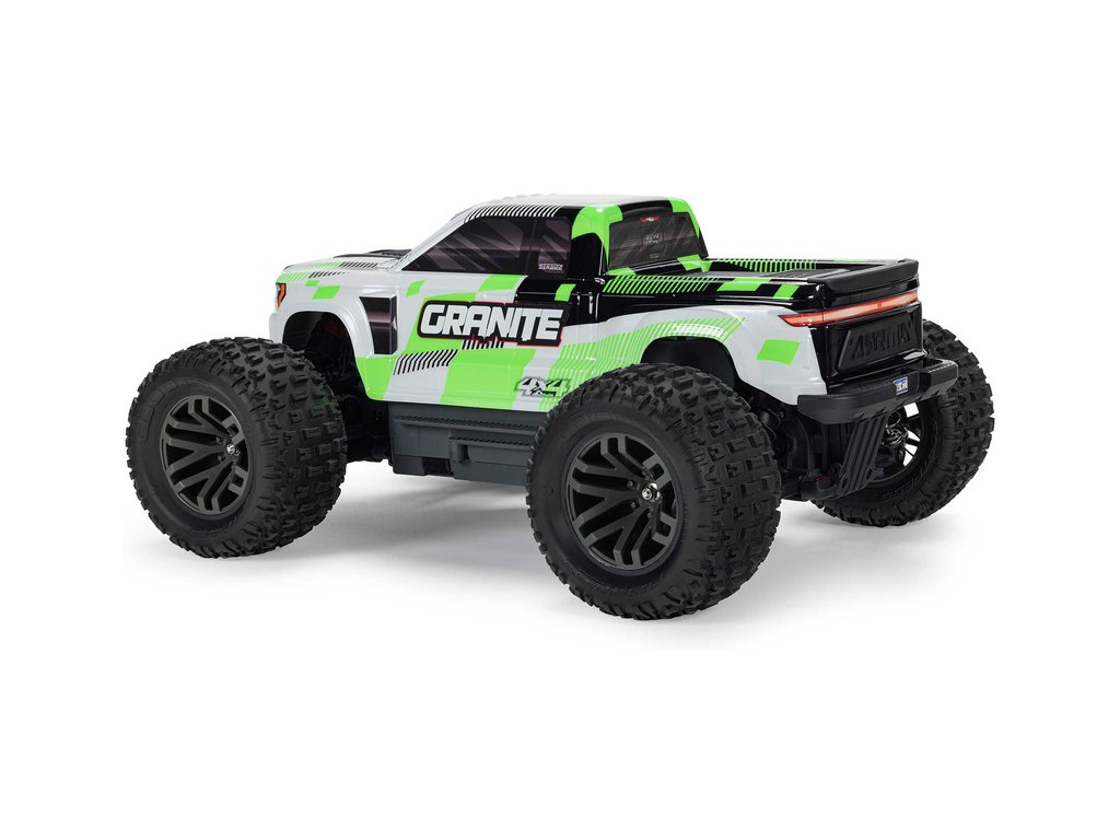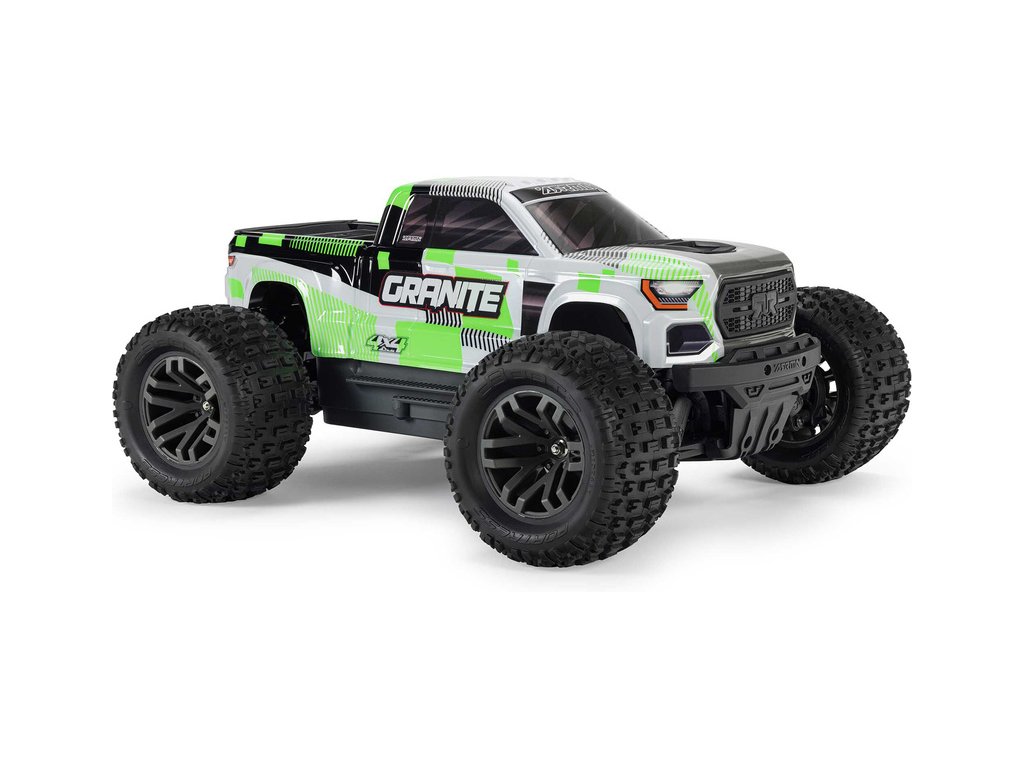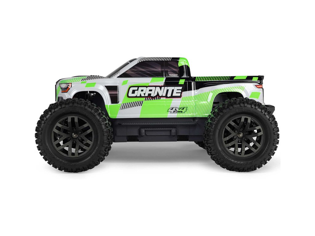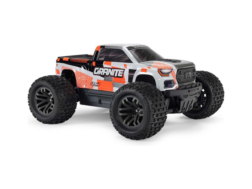 RC model auta Arrma Granite Mega v měřítku 1:10 s pohonem 4x4, ideální pro děti a začátečníky, který nabízí extra točivý moment ihned po vybalení, díky o 11% většímu stejnosměrnému motoru 665 (High Torque). Dosahuje rychlosti až 32 km/h. Odolné šasi s kluznými deskami a zvýšenými bočnicemi proti vnikání nečistot. Robustní diferenciály s kovovými převody. Olejové tlumiče. Bezsponková karoserie pro snadnou výměnu akumulátoru. RC souprava Spektrum SLT2.