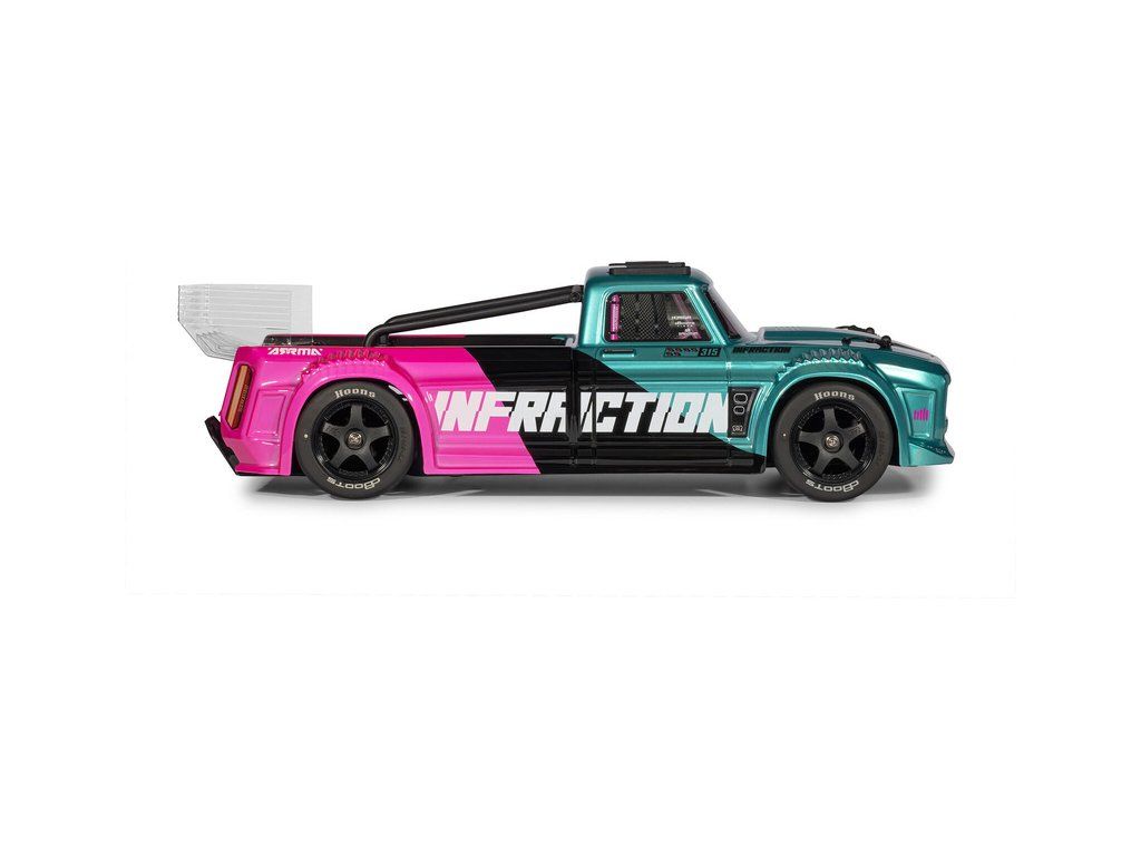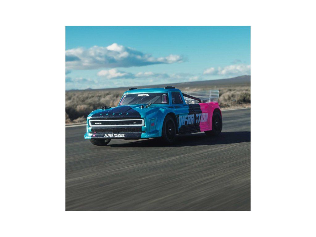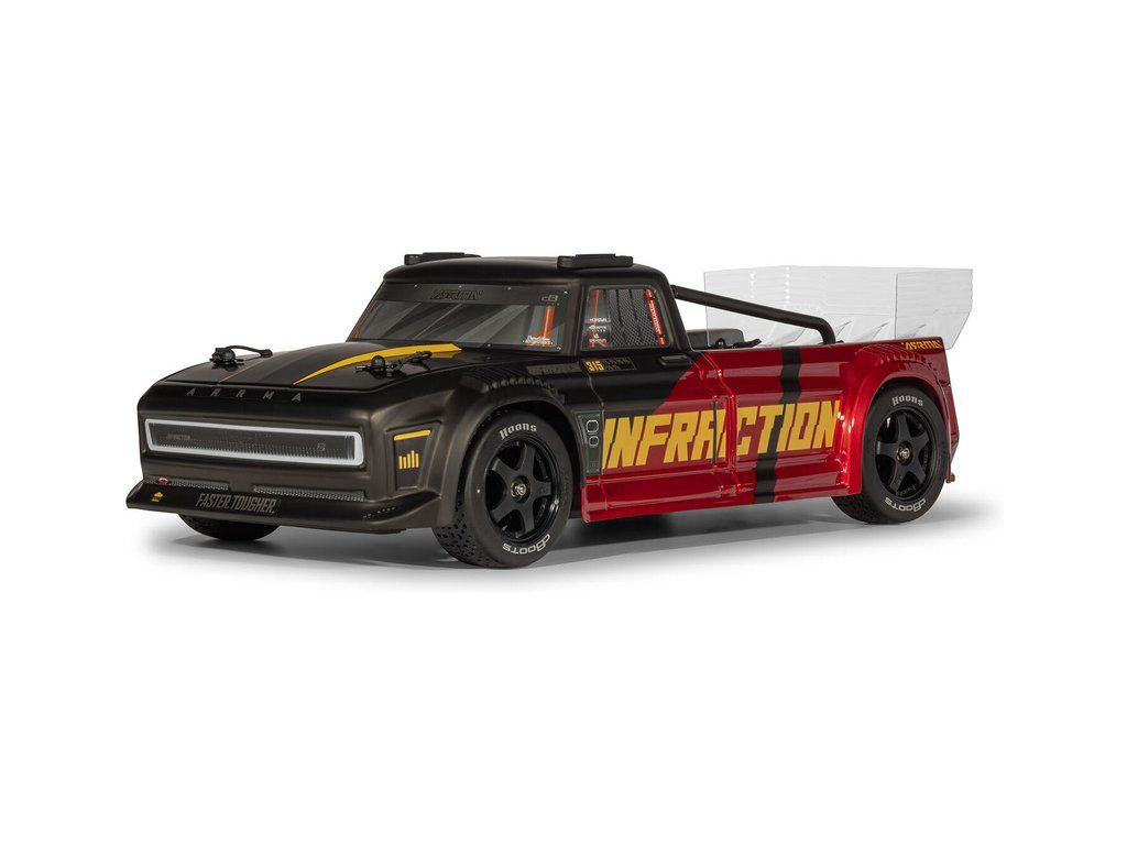 Vzrušující RC model auta Arrma Infraction 223S v měřítku 1:8. Koncepce modelu typu Street Bash je zaměřena na zábavnou jízdu na tvrdých rovných površích. Každé parkoviště, ulička nebo hřiště se tak může stát vaší dráhou. S náhonem 4WD, nezávislým zavěšením, nápravovými diferenciály, olejovými tlumiči a výkonným střídavým pohonem, poskytuje model neuvěřitelnou hbitost, akceleraci a dosáhne rychlosti až 100 km/h (s přibaleným rychlostním pastorkem). Obsažena je exkluzivní stabilizace jízdy DSC. Ještě lepší pocit z jízdy a větší odolnost přinášejí novinky v podobě pneumatik s integrovaným pásem, přepracovaného pohonného ústrojí s kovovými hruškami diferenciálů a středovým absorpčním členem místo třecí spojky. Dále jsou nově instalovány silikonové dorazy tlumičů. Ať už jste nováčkem v jízdě na silnici nebo zkušeným řidičem, model umožňuje pomocí různých funkcí a výběru akumulátoru, přesně upravit vlastnosti dle vašich potřeb.