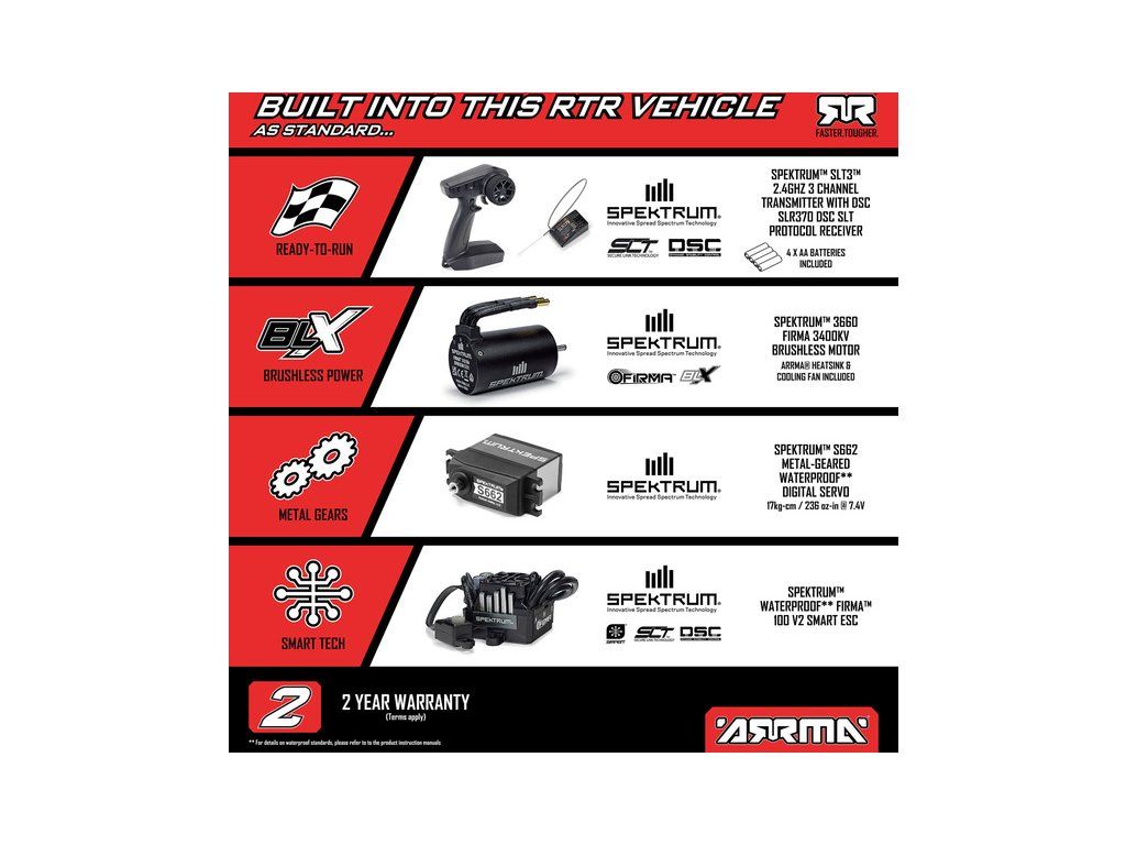 Model obsahuje nejnovější elektronikou Spektrum s nastavitelným regulátorem a přijímačem s exkluzivní stabilizací jízdy DSC, která Vám umožní snadnější řízení i ve vysokých rychlostech a na nerovném povrchu. Intenzita stabilizace je snadno nastavitelná, přičemž si můžete najít ideální poměr pro vás. Dále je obsažen vysílač Spektrum SLT 2.4 GHz pro bezpečný provoz bez výpadků. Komponenty elektroniky v modelu jsou voděodolné* včetně serva řízení Spektrum S662 s vysokým točivým momentem a kovovými převody.