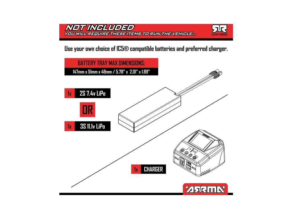 Model lze provozovat na 2 až 3 článkový LiPo akumulátor. Akumulátor by měl být osazen konektorem EC5 nebo IC5. Pro běžné ježdění doporučujeme 2 článkový LiPo akumulátor (7.4 V).
