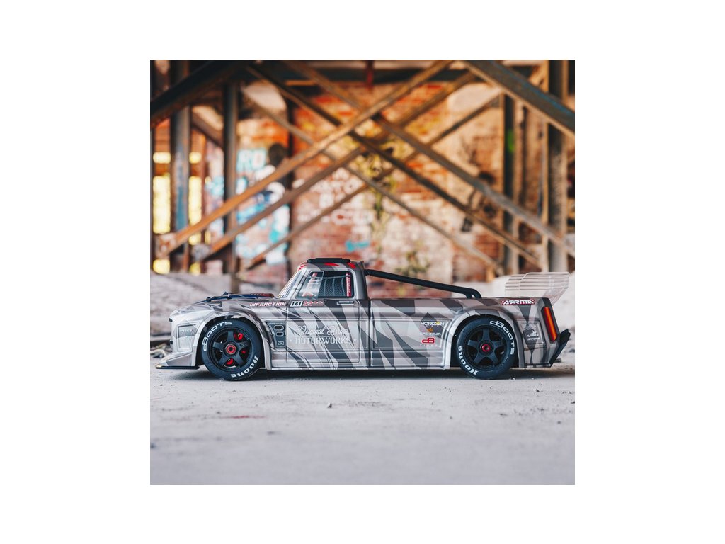 Arrma Infraction v měřítku 1:7, je výkonný RC model, který jede rychlostí až 120 km/h. Model s náhonem na všechna kola 4x4, je zejména vhodný na tvrdé povrchy jako je asfalt, či beton. Poradí si také se šotolinovými povrchy, nízkou trávou a lehkým rovinatým terénem. Model obsahuje dálkově řízenou ruční brzdu, kterou zabrzdíte zadní nápravu. To Vám umožní snadné driftování s modelem. Pokročilá aerodynamika předního nárazníku, zadního difuzoru a spoileru vytváří přítlak, který zlepšuje ovladatelnost modelu. Pneumatiky dBoots® Hoons ™ s vysokou přilnavostí jsou nalepeny na realistických 5-ti paprskových kolech.