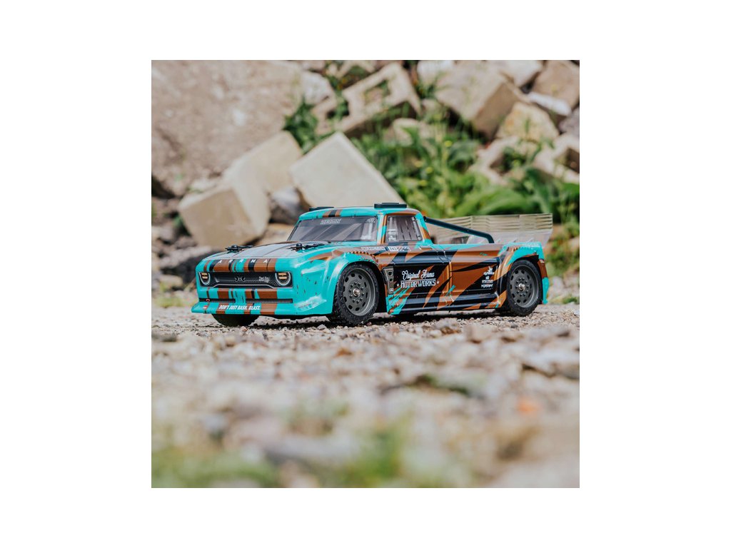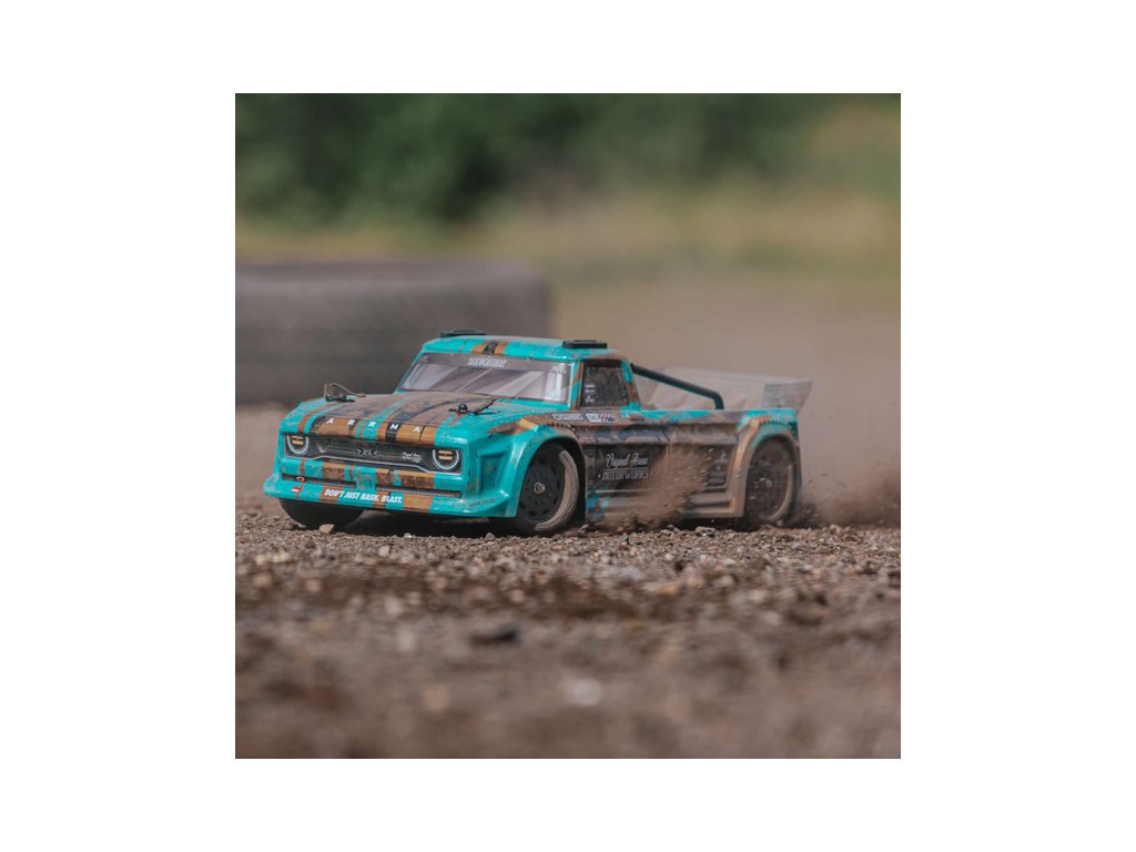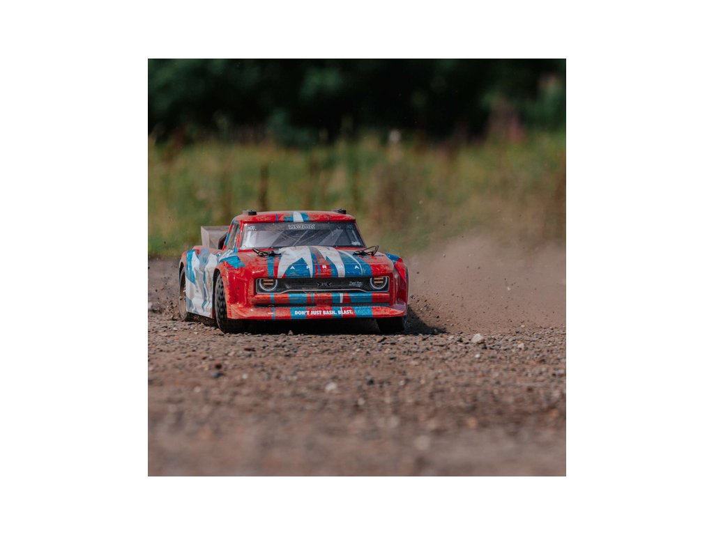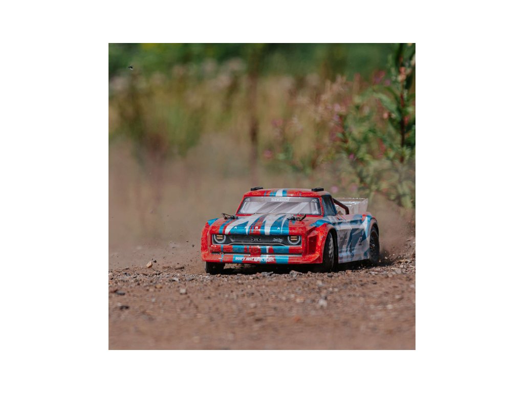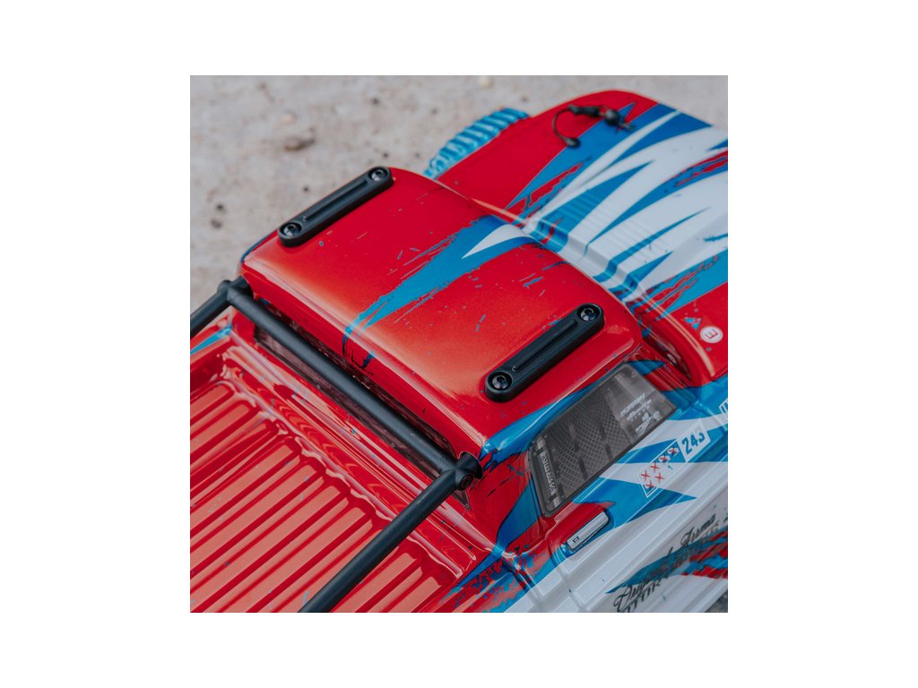 Podvozek doplňuje ohromující karoserie s potiskem v červené/modré nebo modrozelené/bronzové barvě. Střešní ližiny a ochranné oblouky chrání karoserii před poškozením. ARRMA® INFRACTION® 4X4 MEGA Street Bash Resto-Mod Truck je dodáván s 7-článkovou 8,4V NiMH baterií Dynamite® a síťovým nabíječem. Stačí přidat 4 baterie „AA“ do vysílače a můžete vyrazit!