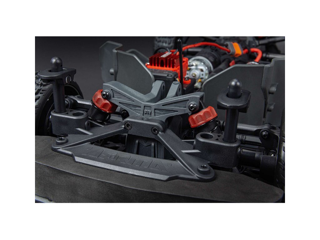 Olejové tlumiče obsahují silikonové O-kroužky a jsou opatřeny závitem, který umožňuje snadné nastavení světlé výšky. V kombinaci s předním a zadním dvojitým lichoběžníkovým zavěšením, předními a zadními výkyvnými tyčemi a velkým zadním dvojitým difuzorem, nabízí INFRACTION® 4X4 Mega Street Bash Resto-Mod Truck RTR dokonalou ovladatelnost na všech silnicích.