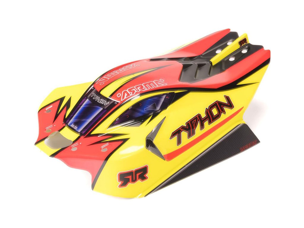 Náhradní díl pro RC model auta Arrma Typhon 223S 1:8 BLX: karosérie bezsponková Typhon 1:8, žlutá/červená.