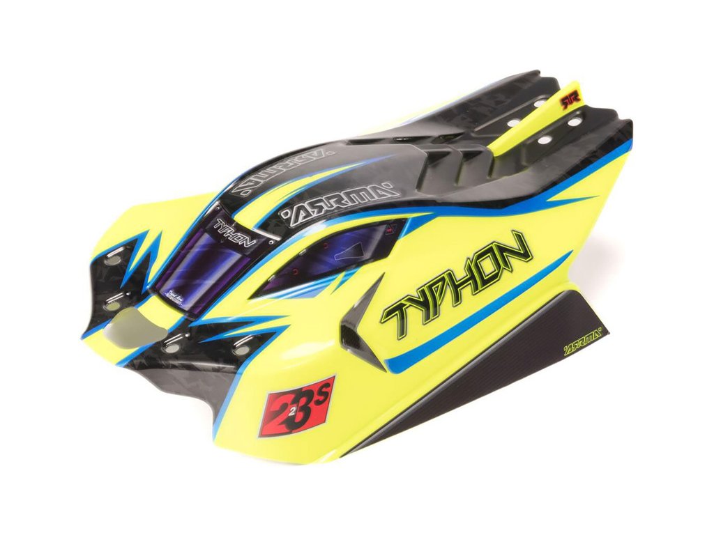 Náhradní díl pro RC model auta Arrma Typhon 223S 1:8 BLX: karosérie bezsponková Typhon 1:8, žlutá/modrá.