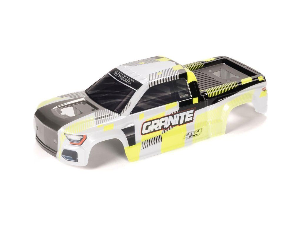 Náhradní díl pro RC model auta Arrma Granite 223S BLX 1:10 4WD: karosérie bezsponková žlutá. Nabarvená, oříznutá s aplikovanou grafikou.