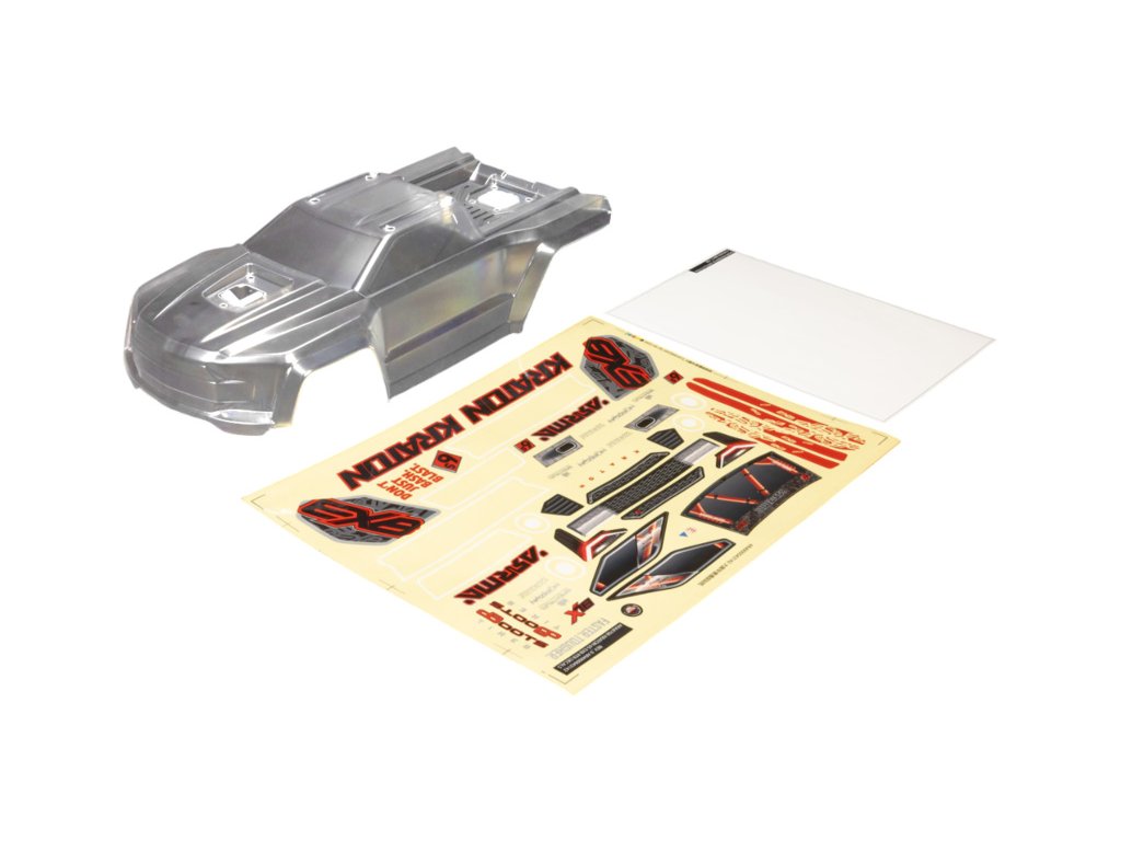 Náhradní díl pro RC modely aut Arrma 1:8 Kraton 6S BLX V6: karosérie nenabarvená. Polykarbonátová karoserie, oříznutá pro snadnou montáž. Určeno pro bezsponkový systém uchycení. Sada uchycení karoserie není obsahem balení.