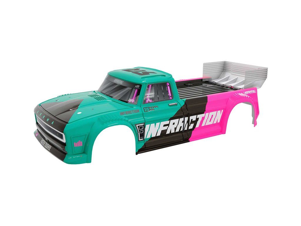 Arrma karosérie tyrkysová/růžová: Infraction 4X4 All-Road 3S BLX. Hotová nabarvená polykarbonátová karoserie s aplikovanými obtisky.
