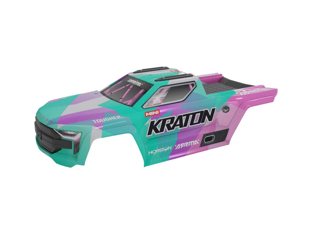 Arrma karosérie tyrkysová/růžová: Mini Kraton. Nabarvená, ořezaná karoserie s předvrtanými otvory. Vyrobeno z odolného polykarbonátu.