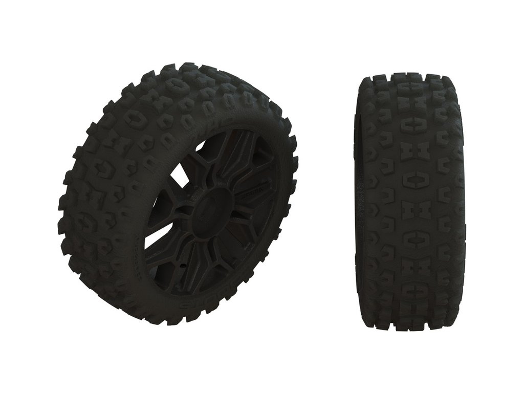 Kola Arrma černé s nalepenými pneu 2HO. Designová paprsková kola z tvrdého nylonu s nalepenými pneumatikami 2HO na široké spektrum povrchů. Šestihran 17 mm, průměr disku 83 mm, průměr celkem 117 mm, šířka 44 mm.
